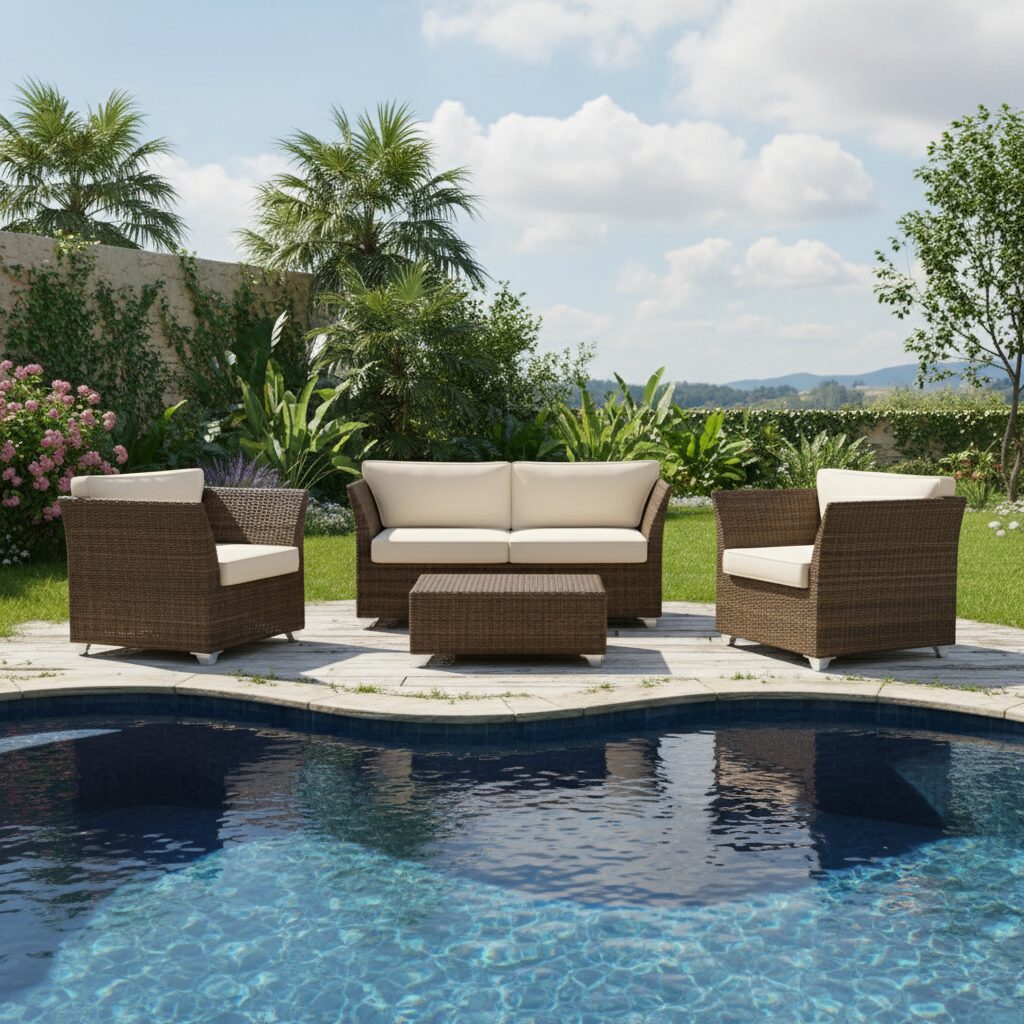 Salotto alta qualità per esterno Don Pepe, realizzato con telaio in alluminio verniciato a polvere, intreccio in corda di polietilene ad alta densità.
