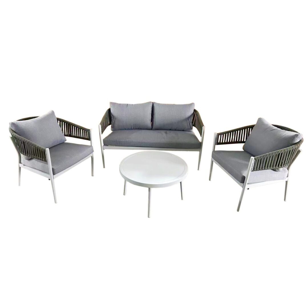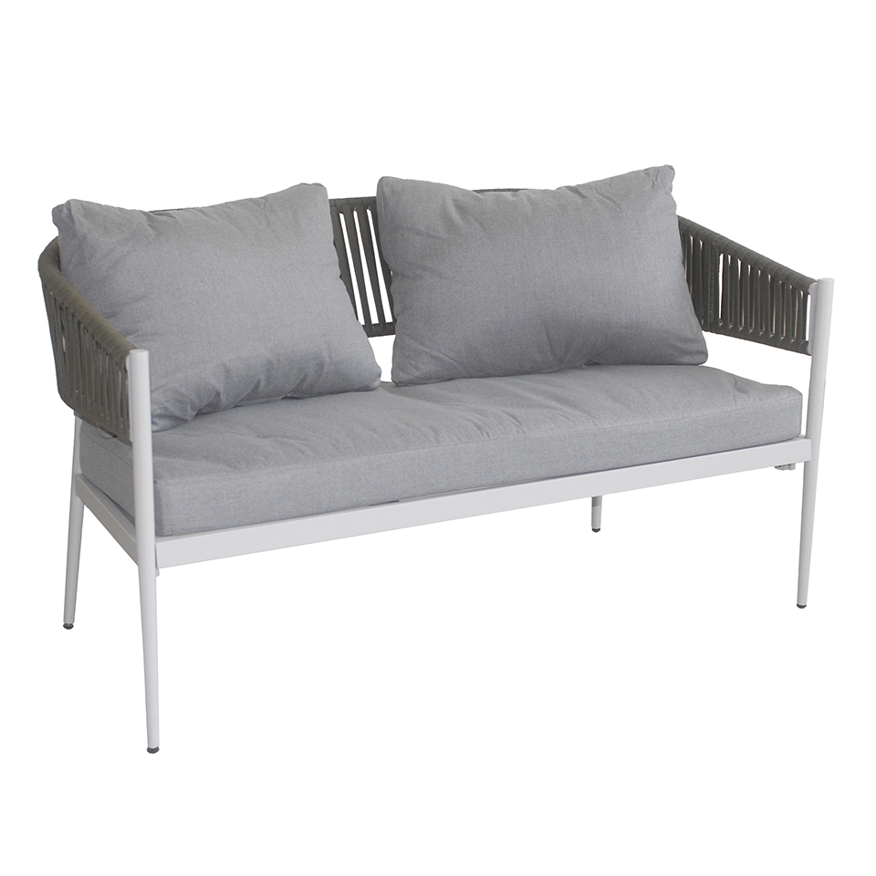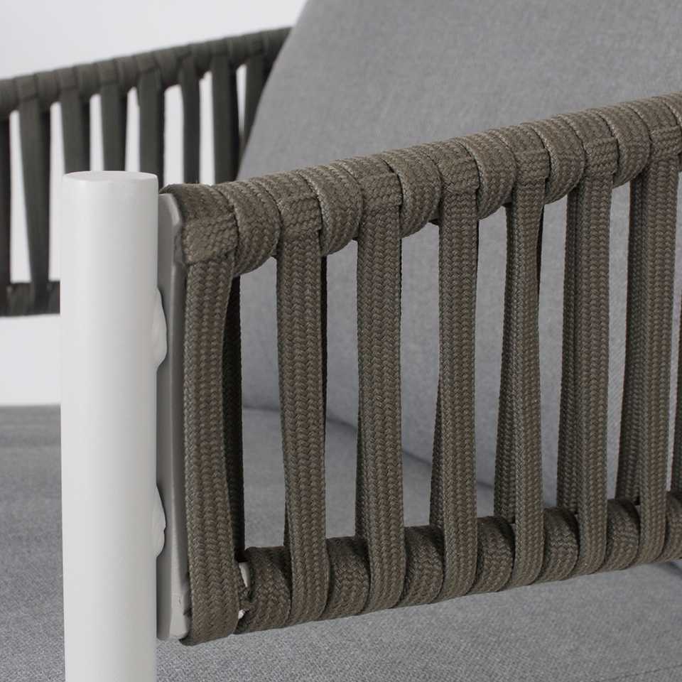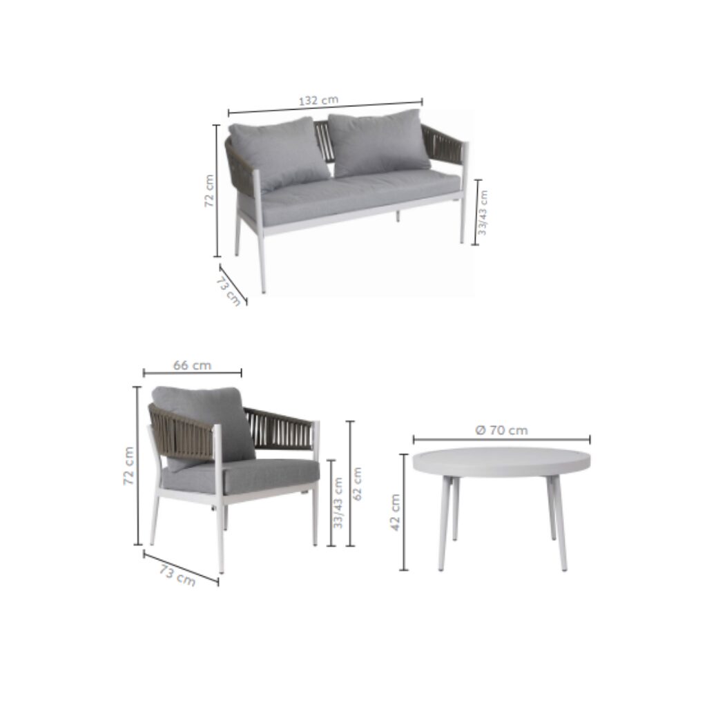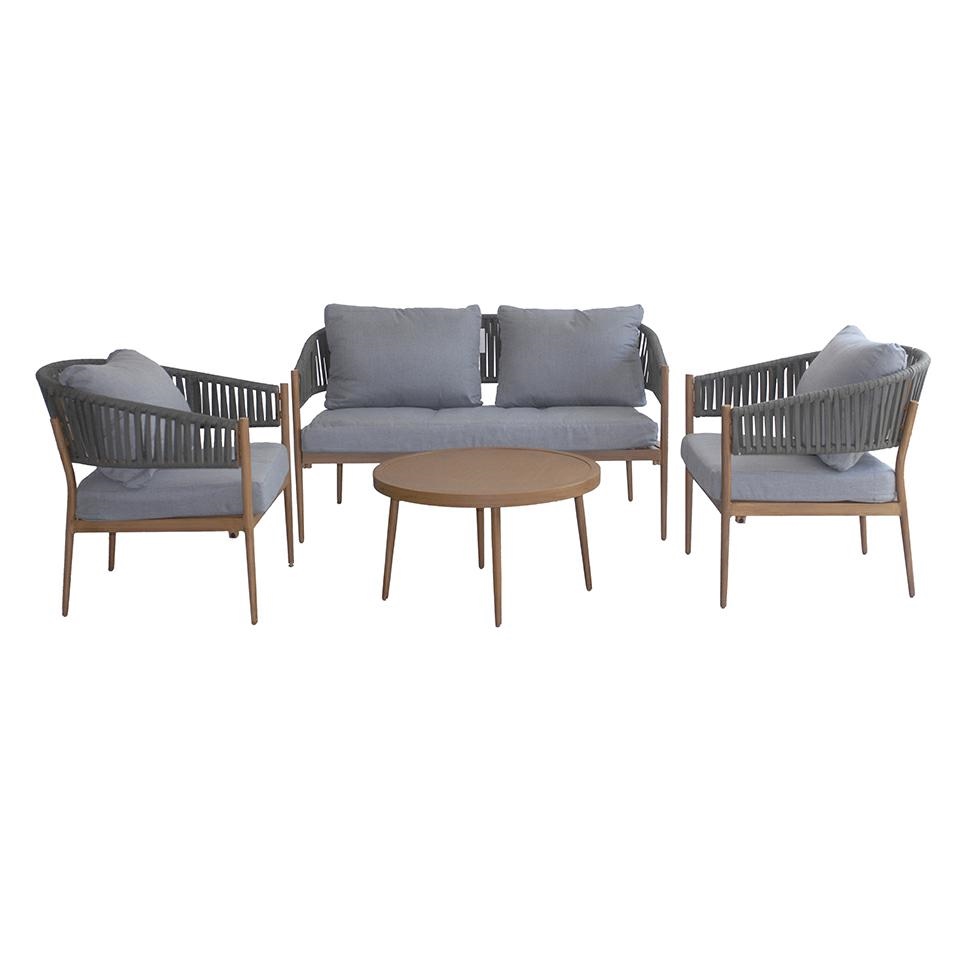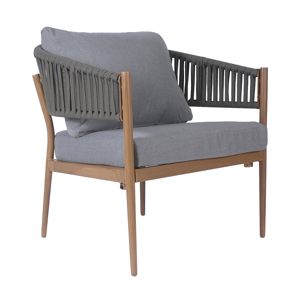 Ogni elemento è realizzato in alluminio con finitura effetto legno, impreziosito da schienali intrecciati in corda sintetica, per un design moderno e ricercato. I cuscini, in morbido tessuto di poliestere, offrono un’eccellente sensazione di comfort e sono pensati per essere pratici e facili da pulire.