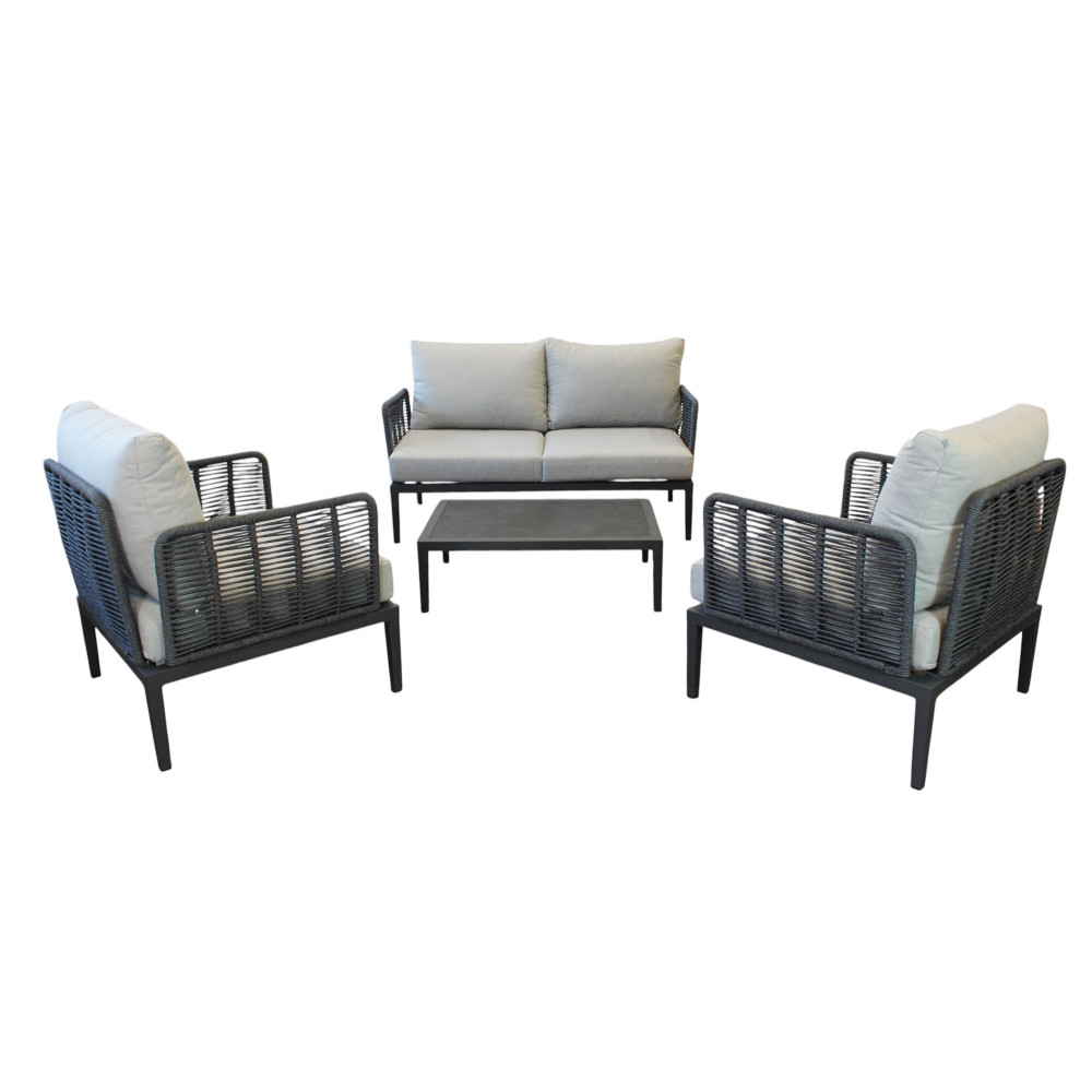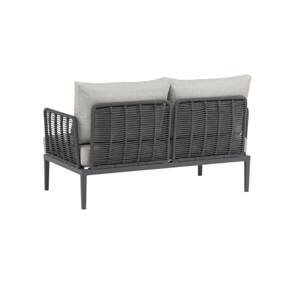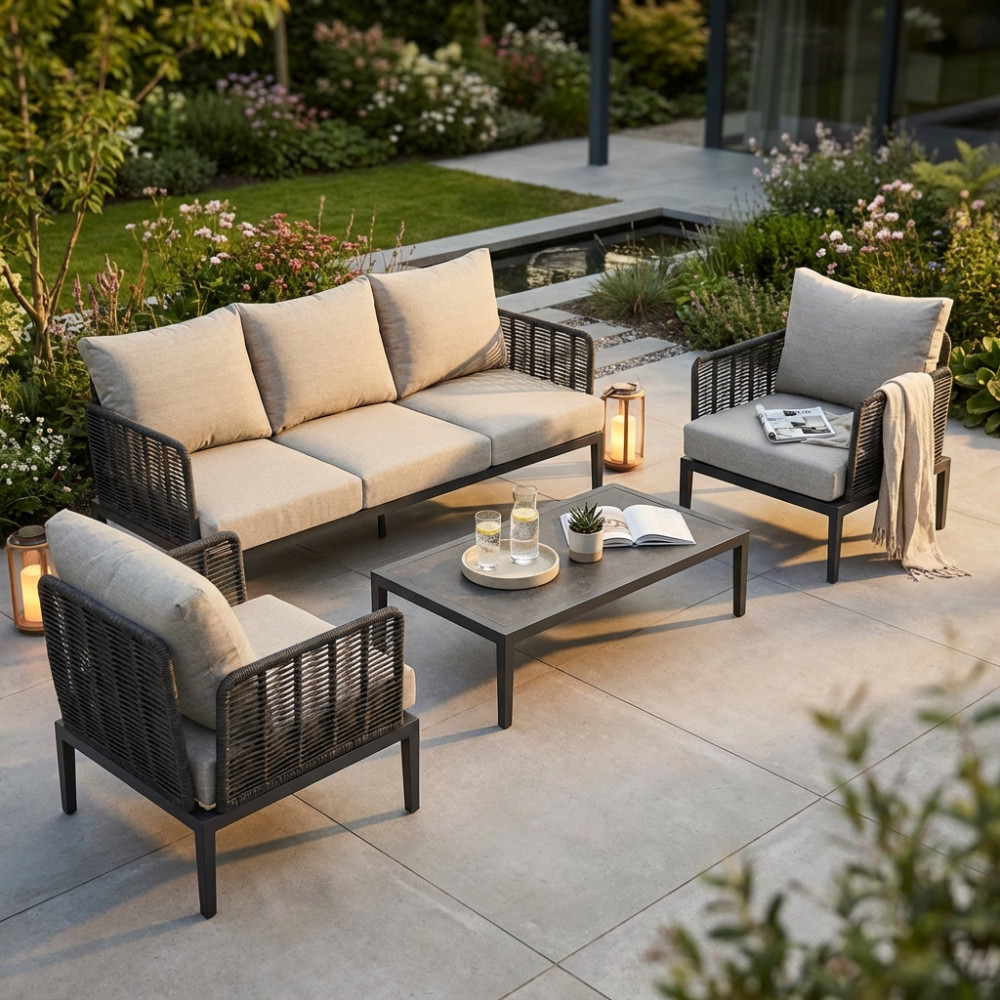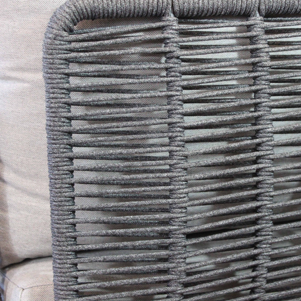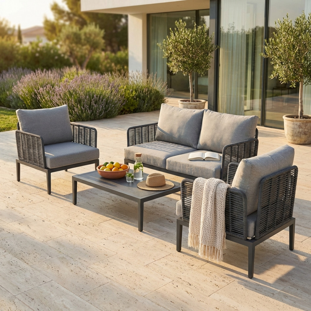 Questo set da esterno, composto da un divano a due posti e due poltrone, è la scelta ideale per chi cerca un perfetto equilibrio tra raffinatezza e funzionalità. La struttura in alluminio, leggera ma solida, garantisce resistenza, mentre la corda intrecciata in PVC, resistente agli agenti atmosferici, conferisce un tocco di freschezza e un design contemporaneo.