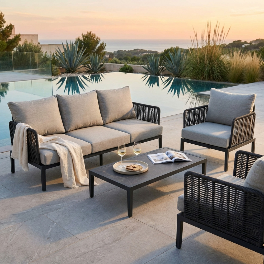 I cuscini, completamente sfoderabili e lavabili, ti offrono la comodità di una manutenzione facile e veloce, rendendo il set ideale per ogni stagione. Il tavolino con piano in pietra sinterizzata aggiunge un elemento di sofisticazione al tutto, creando un angolo perfetto per goderti una bevanda, leggere o passare del tempo in compagnia.