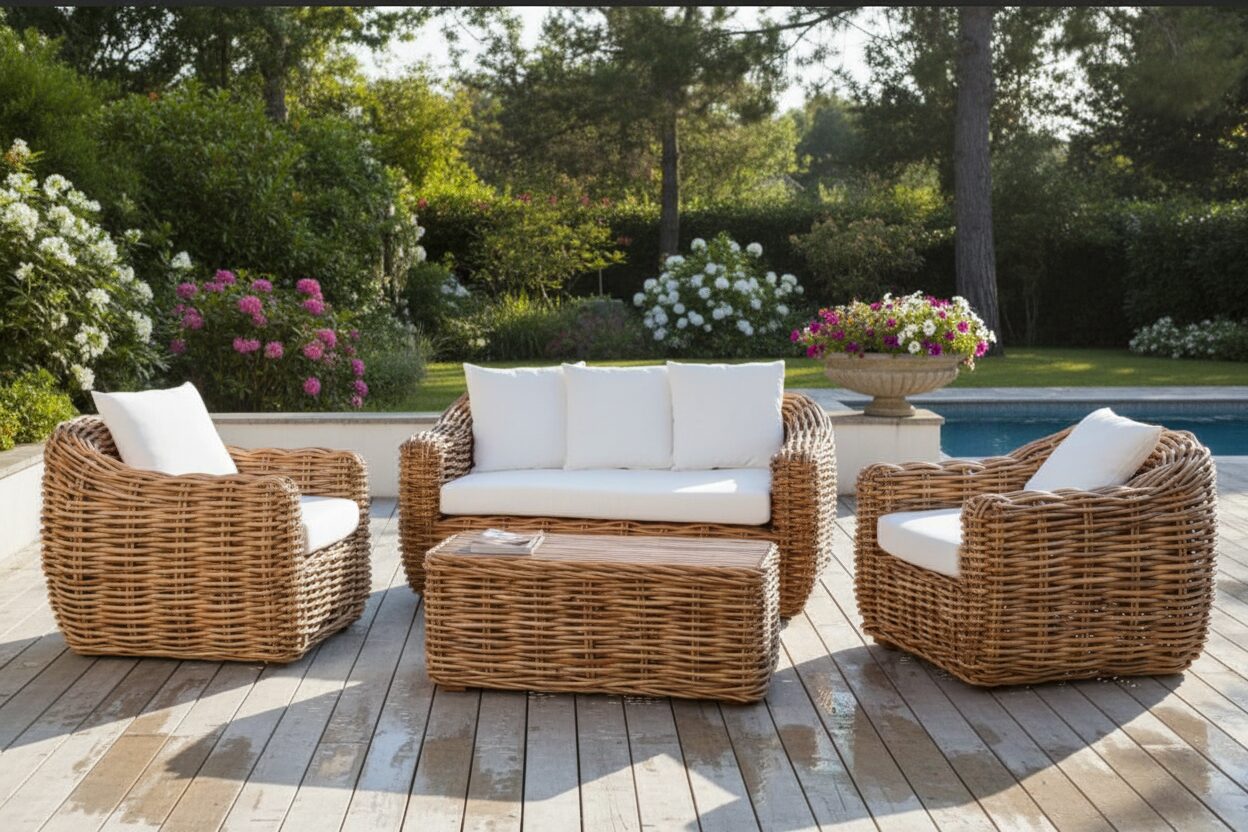 Salotto unico ed originale nel suo genere, per arredare il vostro giardino o il vostro spazio esterno. Costruito interamente in rattan naturale. I cuscini dello schienale e delle sedute sono rimovibili e sfoderabili in colore bianco.