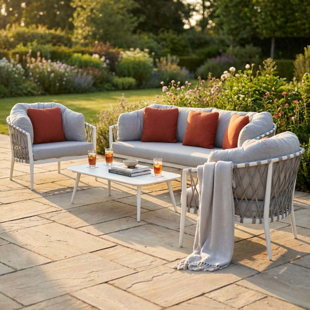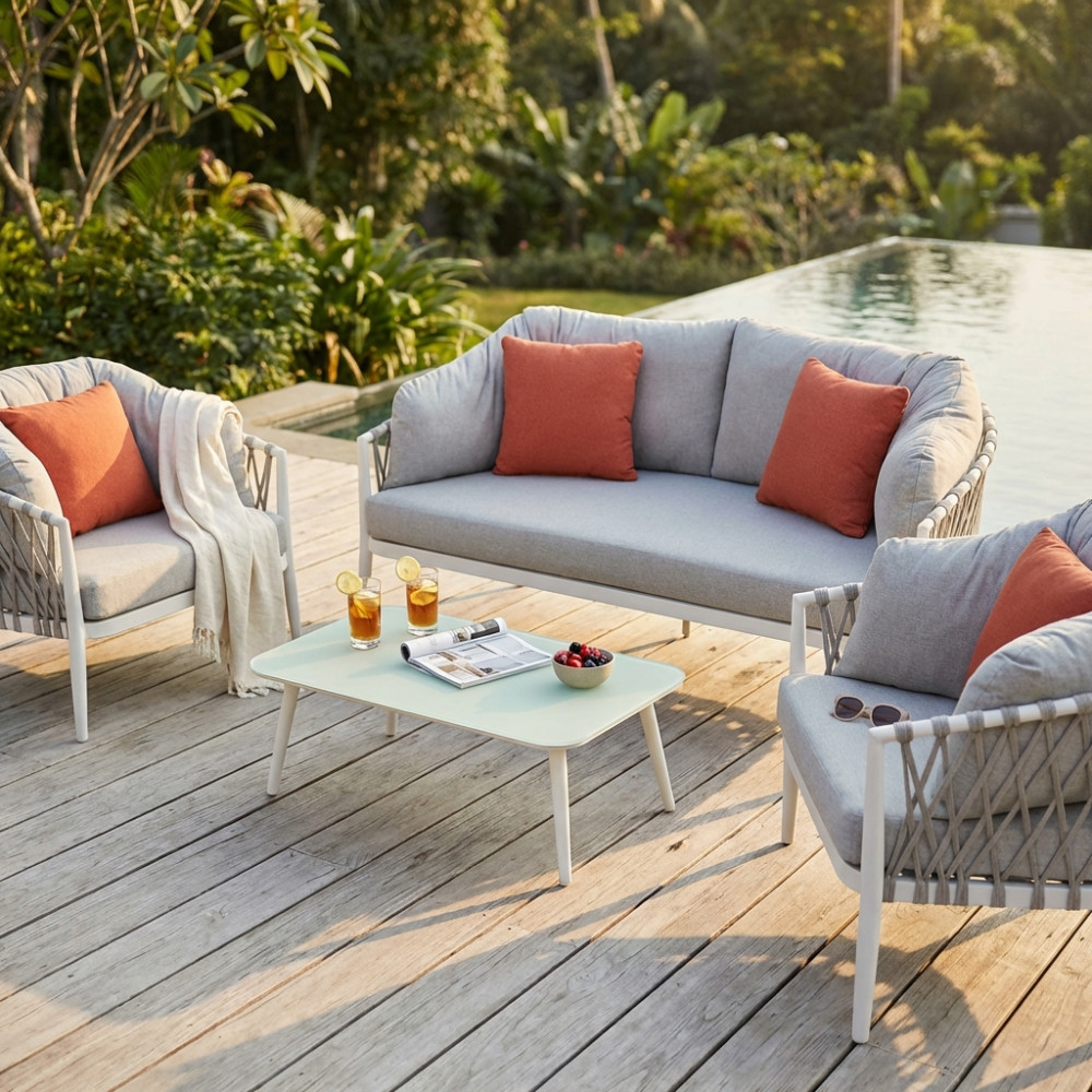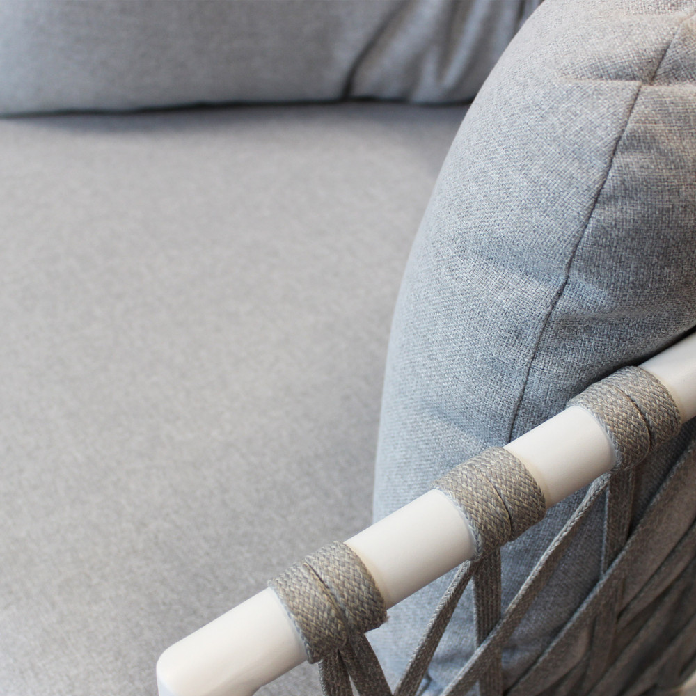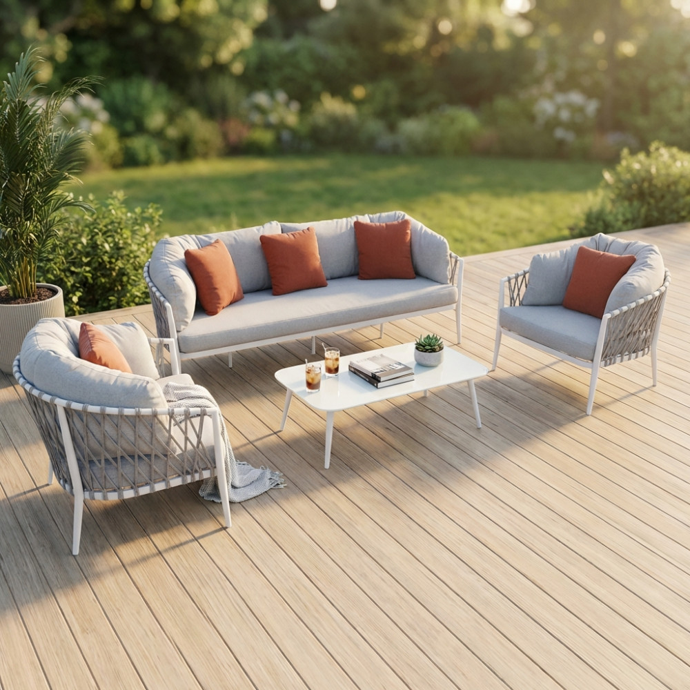 Questo set da esterno, composto da un divano a due posti e due poltrone, è la scelta ideale per chi cerca un perfetto equilibrio tra raffinatezza e funzionalità. La struttura in alluminio, leggera ma solida, garantisce resistenza, mentre la corda intrecciata in PVC, resistente agli agenti atmosferici, conferisce un tocco di freschezza e un design contemporaneo.