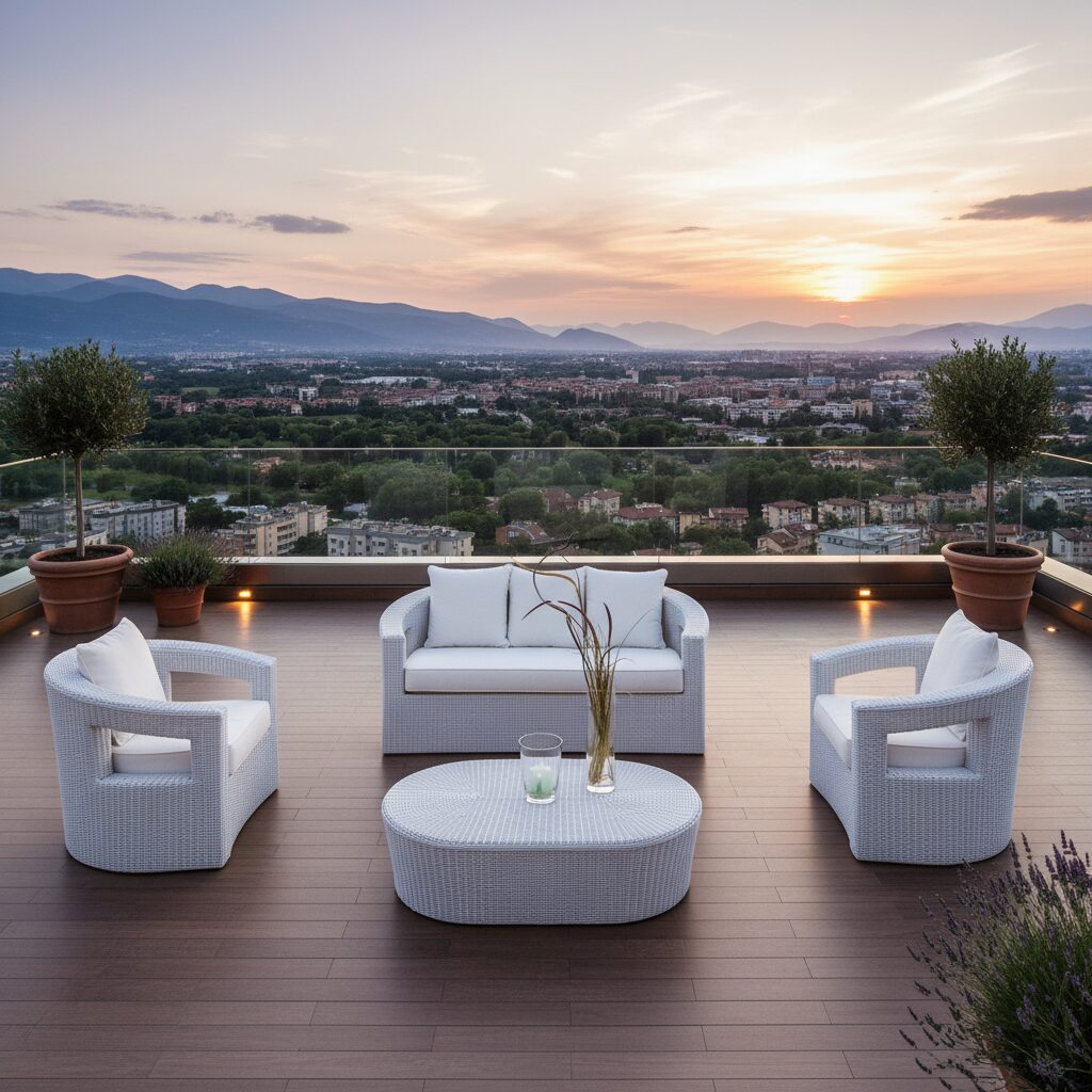La fibra polyrattan (rattan sintetico) utilizzata è di marca REHAU). Resistente ad agenti atmosferici e escursioni termiche.