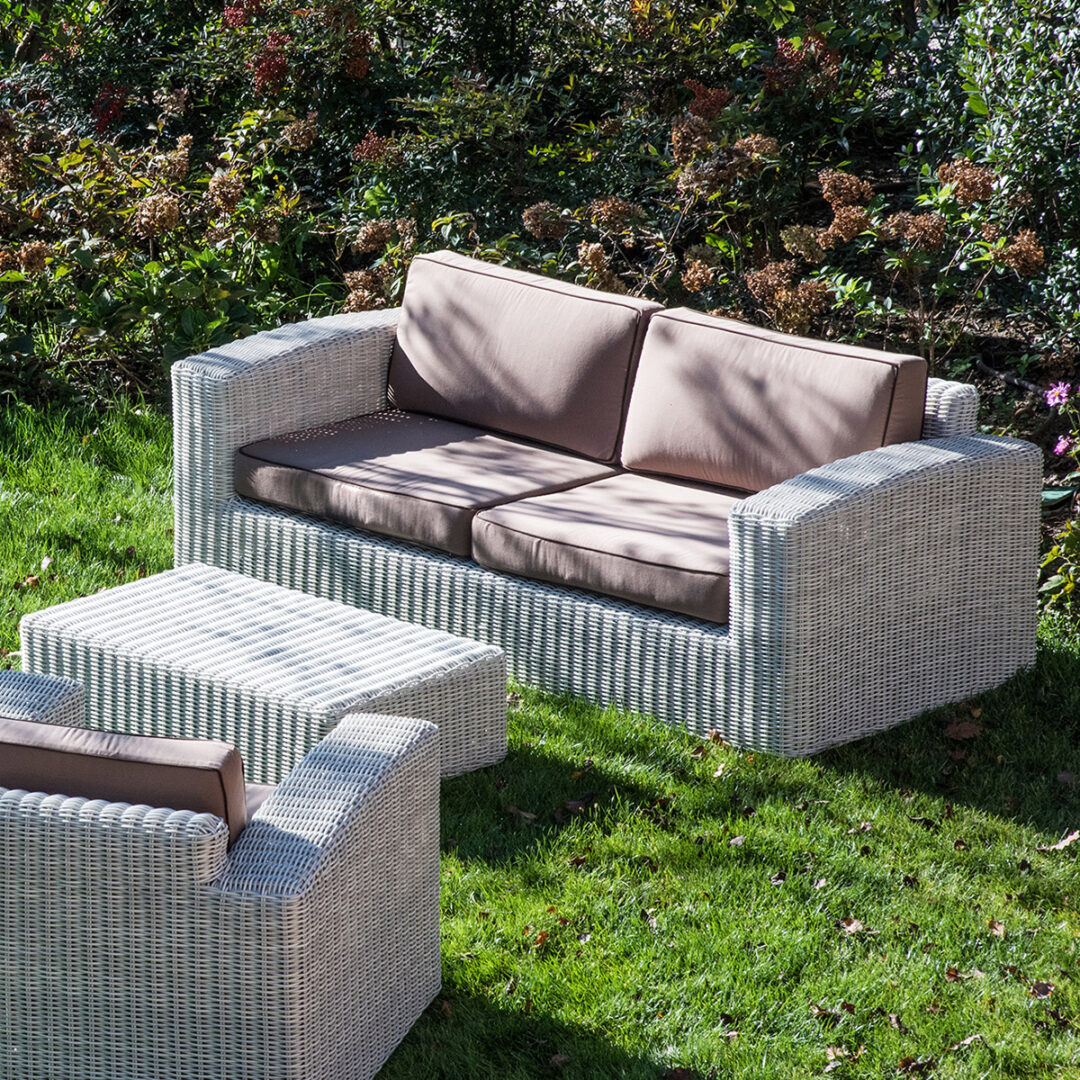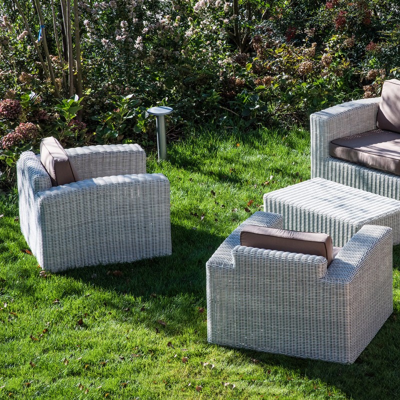 La fibra polyrattan (rattan sintetico) utilizzata è top di gamma per qualità estetica e longevità (marca REHAU). Resistente ad agenti atmosferici e escursioni termiche. Il polietilene ad alta densità di marca Rehau, intrecciato a mano su telai di alluminio, rende questo set arredo da giardino un prodotto d’arredo di qualità .