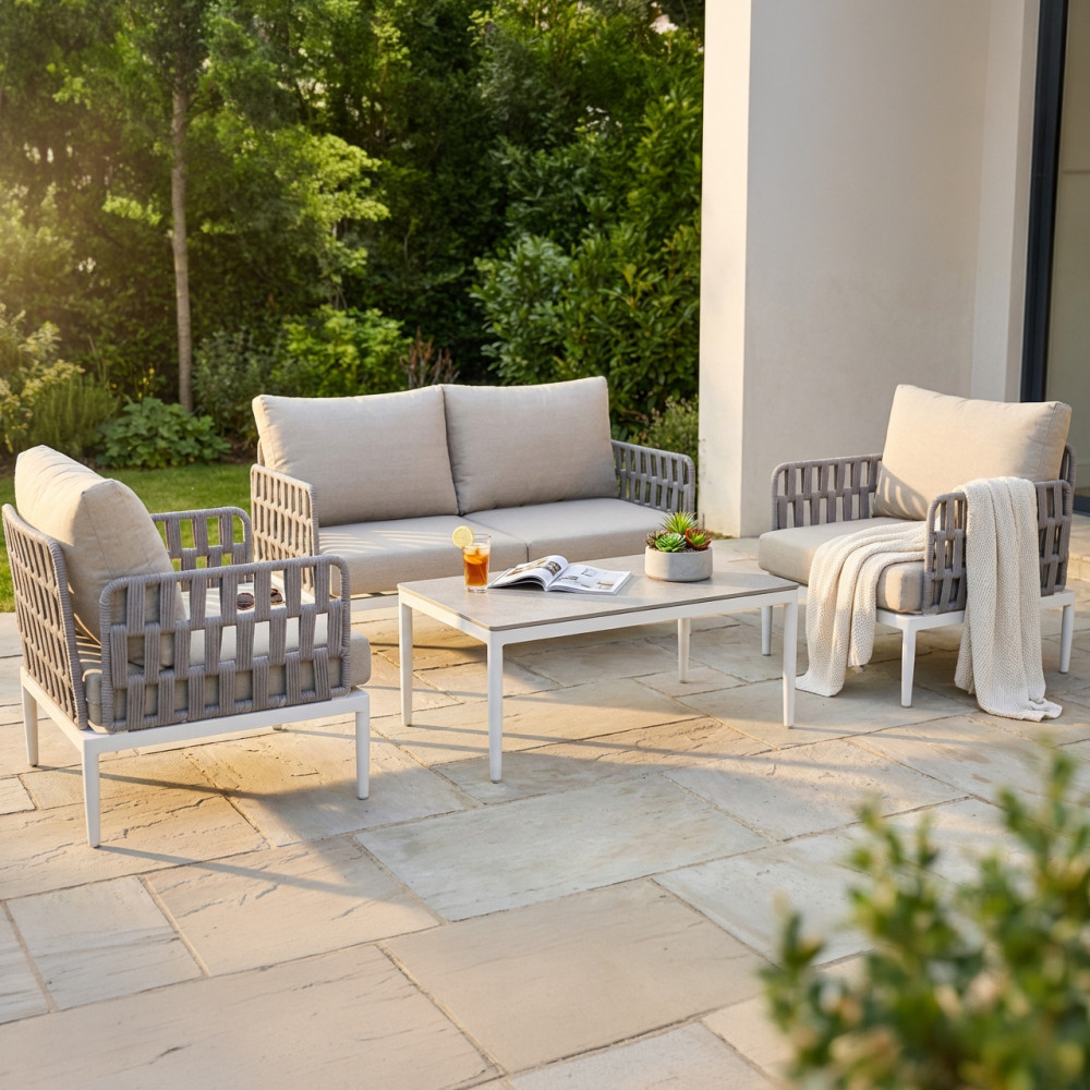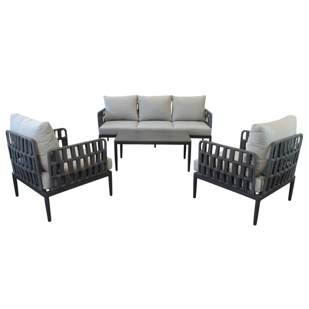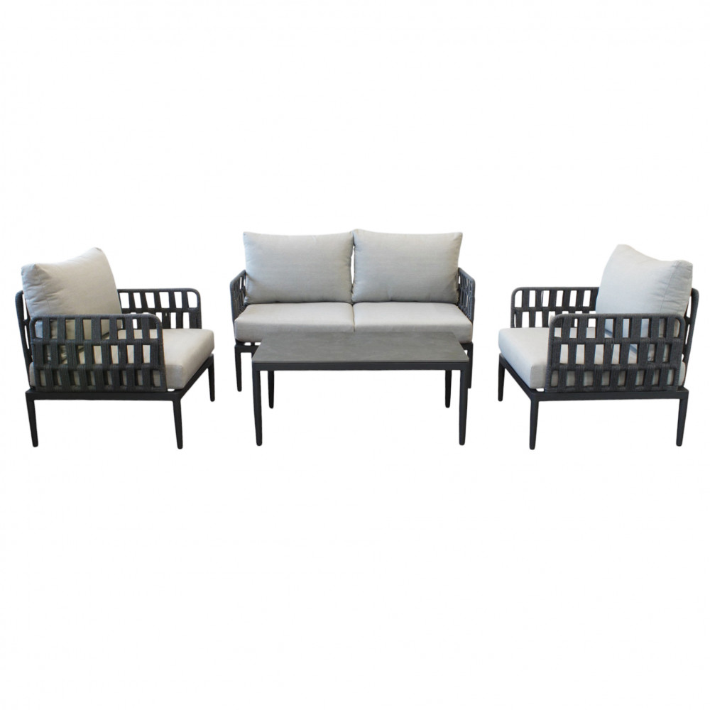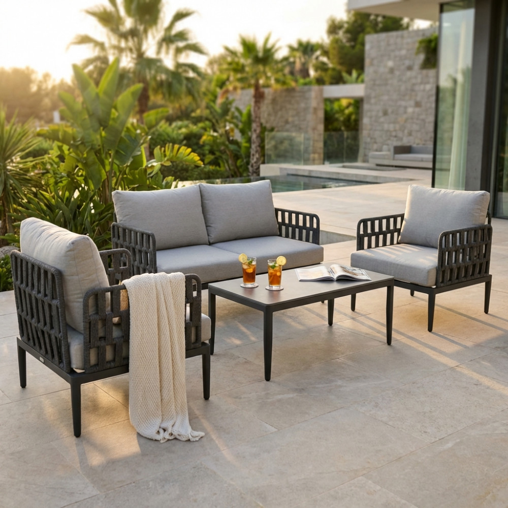 Regala un nuovo volto al tuo spazio esterno con questo salotto da giardino dal design ricercato, pensato per offrire comfort e stile in ogni dettaglio. La struttura in alluminio, solida ma leggera, assicura una grande durabilità e resistenza nel tempo, mentre lo schienale con intreccio in fettuccia di PVC dona un tocco moderno e distintivo, perfetto per ambienti dal gusto contemporaneo.