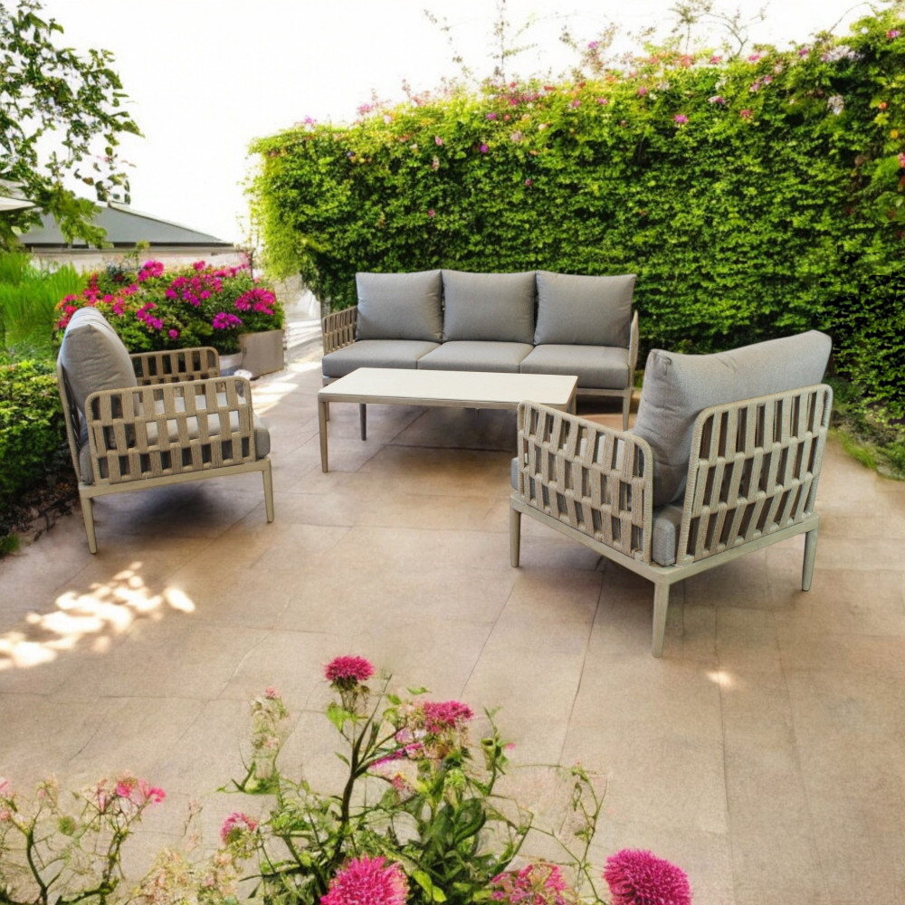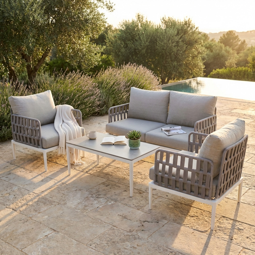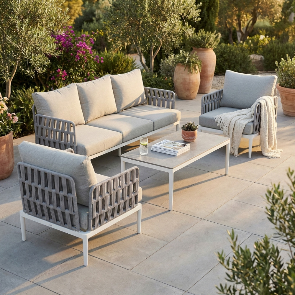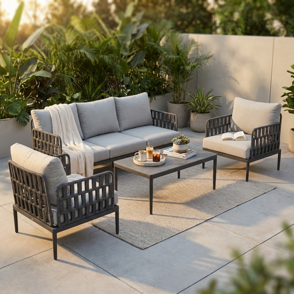 Perfetto per terrazzi, giardini o verande, questo salotto outdoor è la soluzione ideale per creare un’area lounge elegante e funzionale, dove godersi momenti di convivialità o puro relax all’aria aperta.