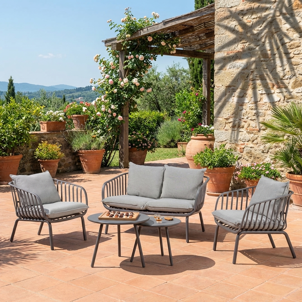 Il set comprende un divano a due posti, due poltrone e due tavolini coordinati, con comodi cuscini sfoderabili in tessuto idrorepellente per un maggiore comfort.