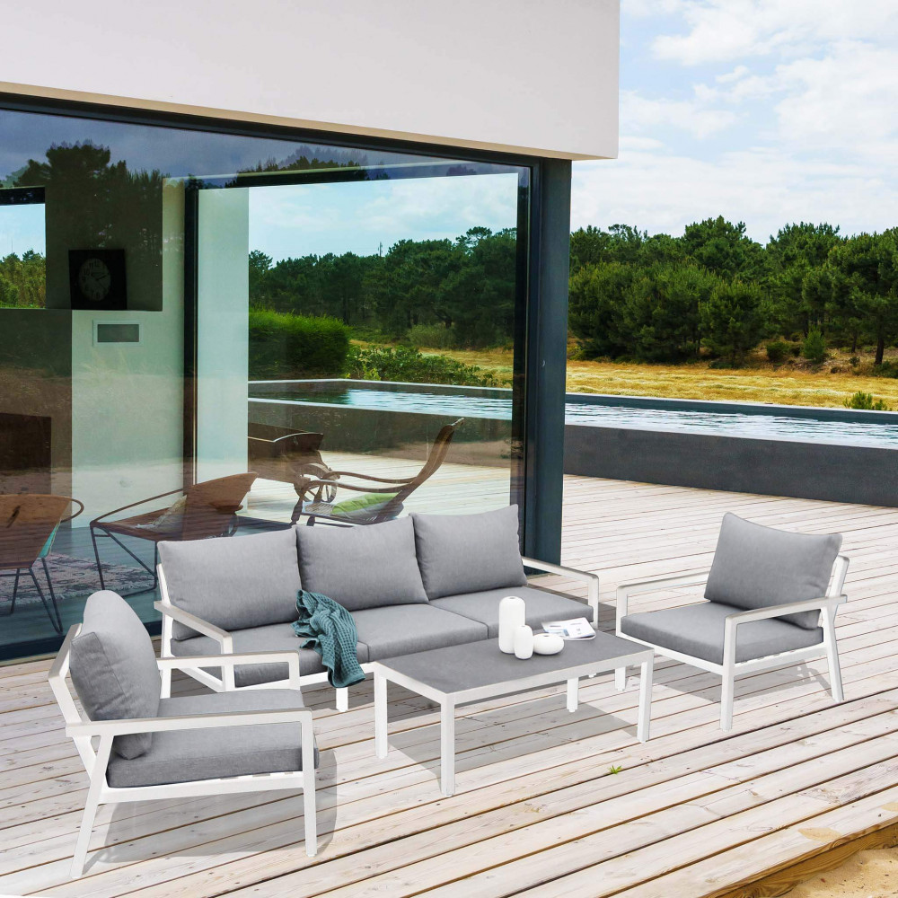 Questo set ha la struttura in alluminio verniciato. Il tavolino è di forma rettangolare. La seduta del divano e delle poltrone è in poliestere.