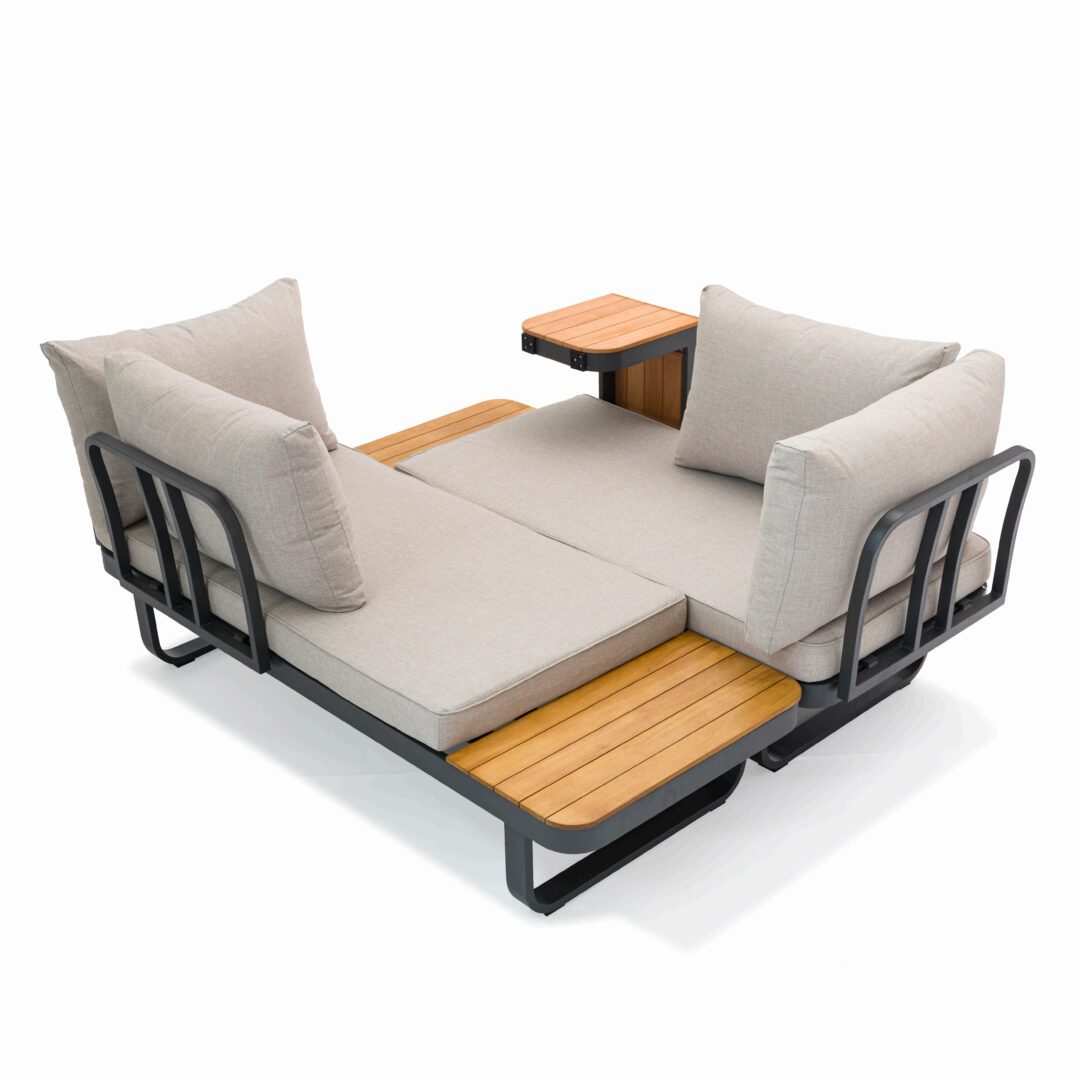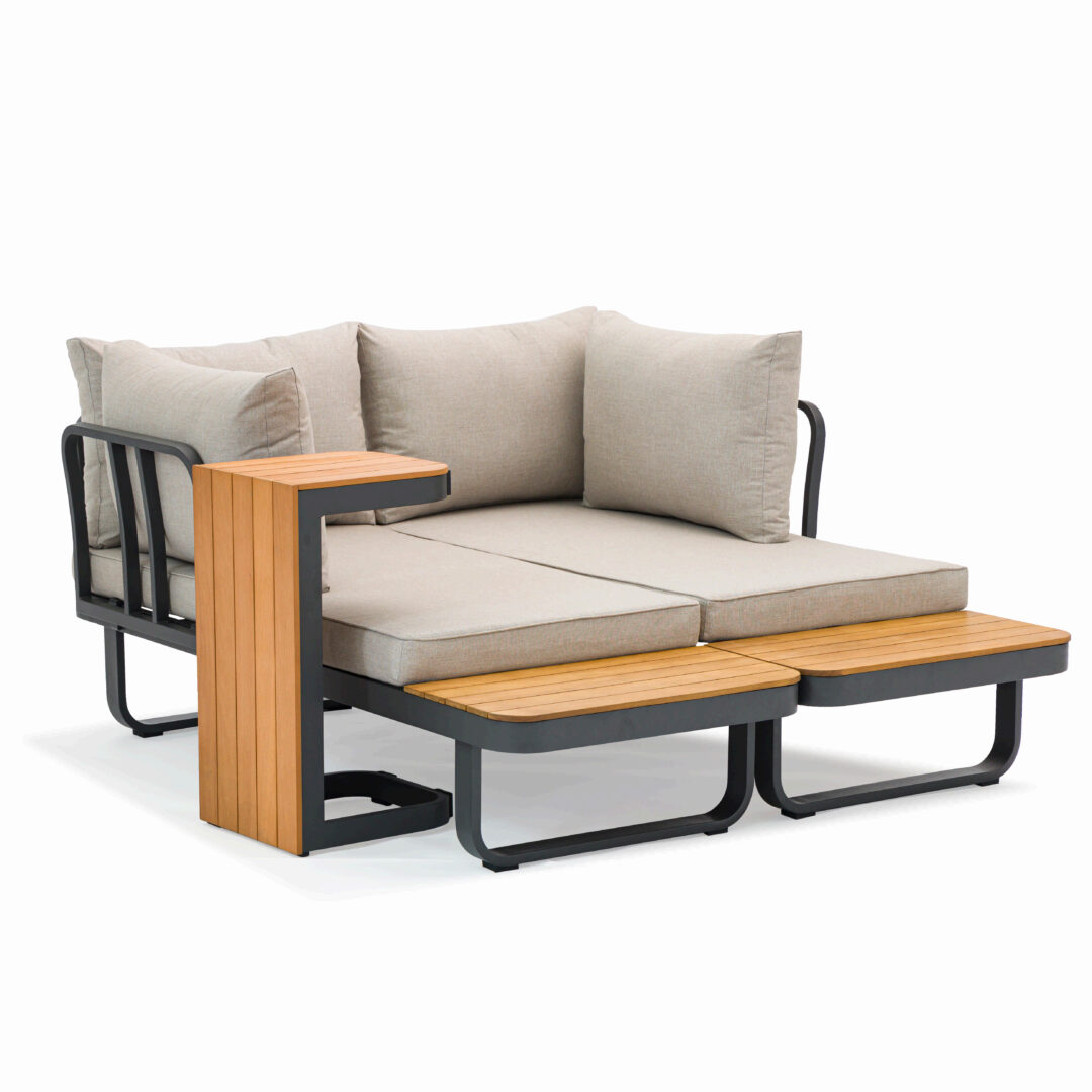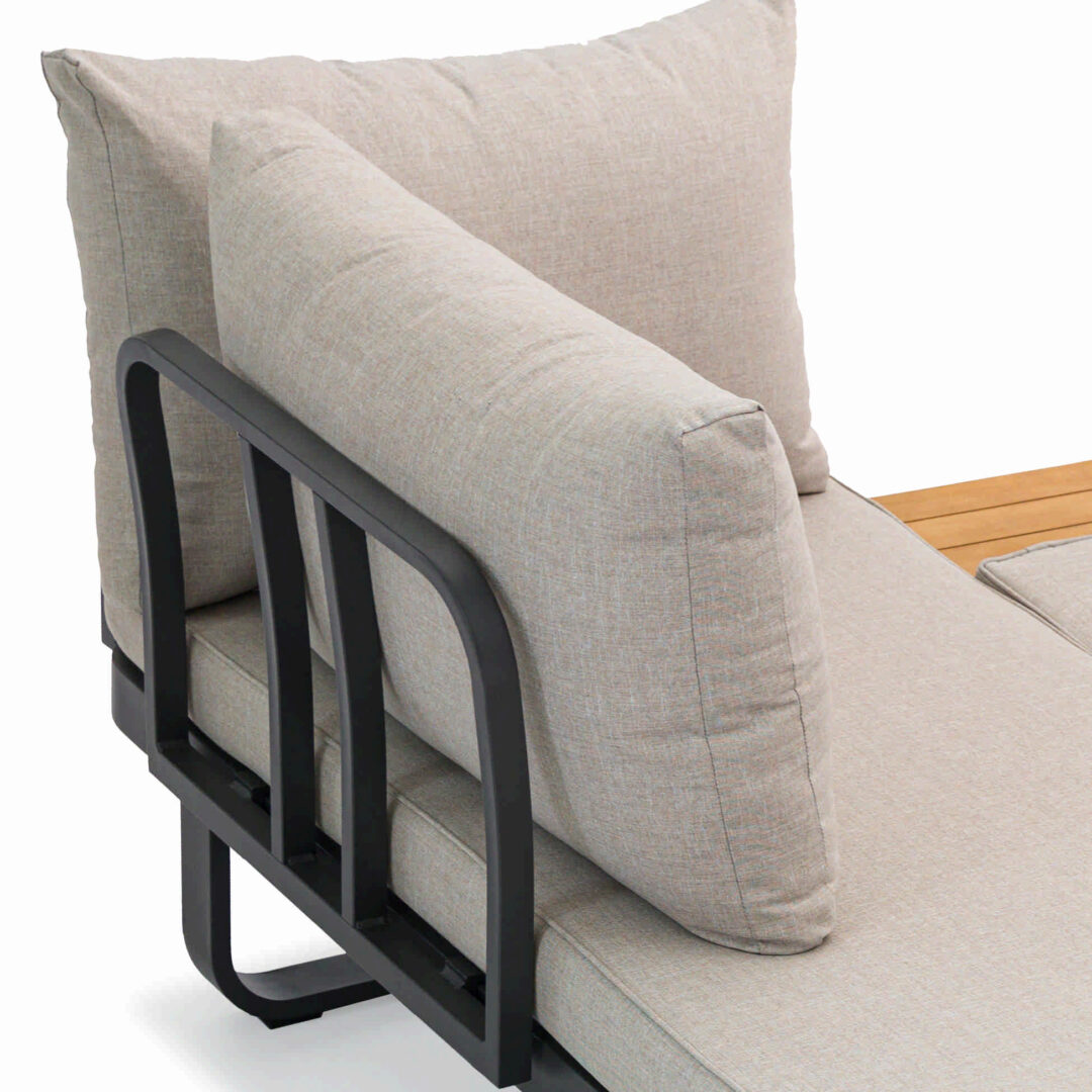 Sia lo schienale che il tavolino laterale si possono spostare con facilità. Grazie a un sistema di incastro innovativo, Sirmione si trasforma con semplicità per rispondere a qualsiasi esigenza di spazio o stile.