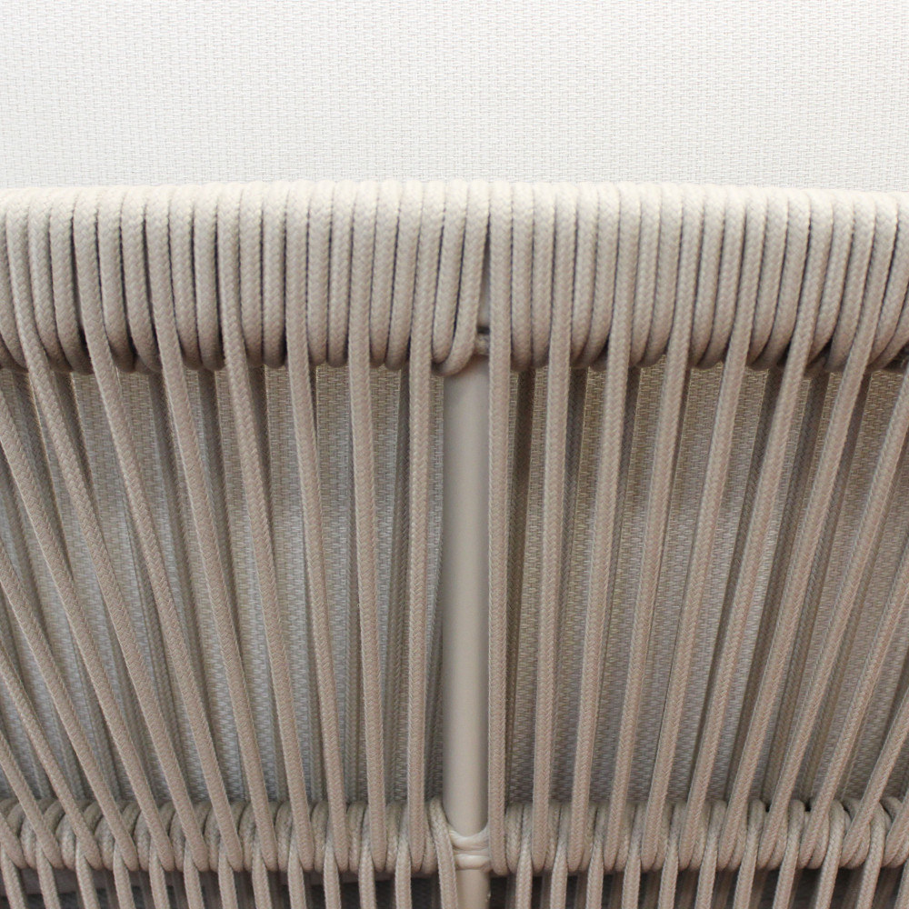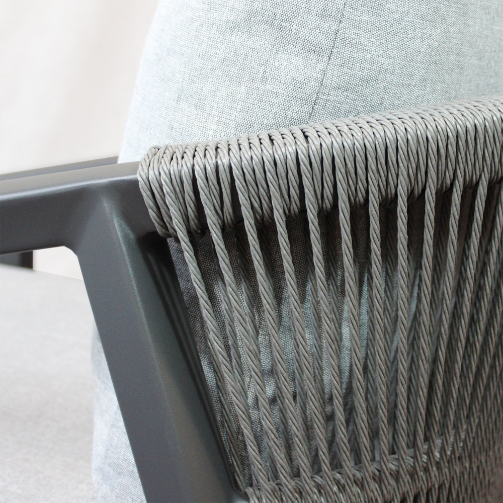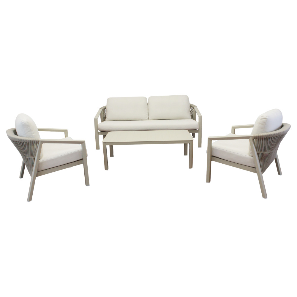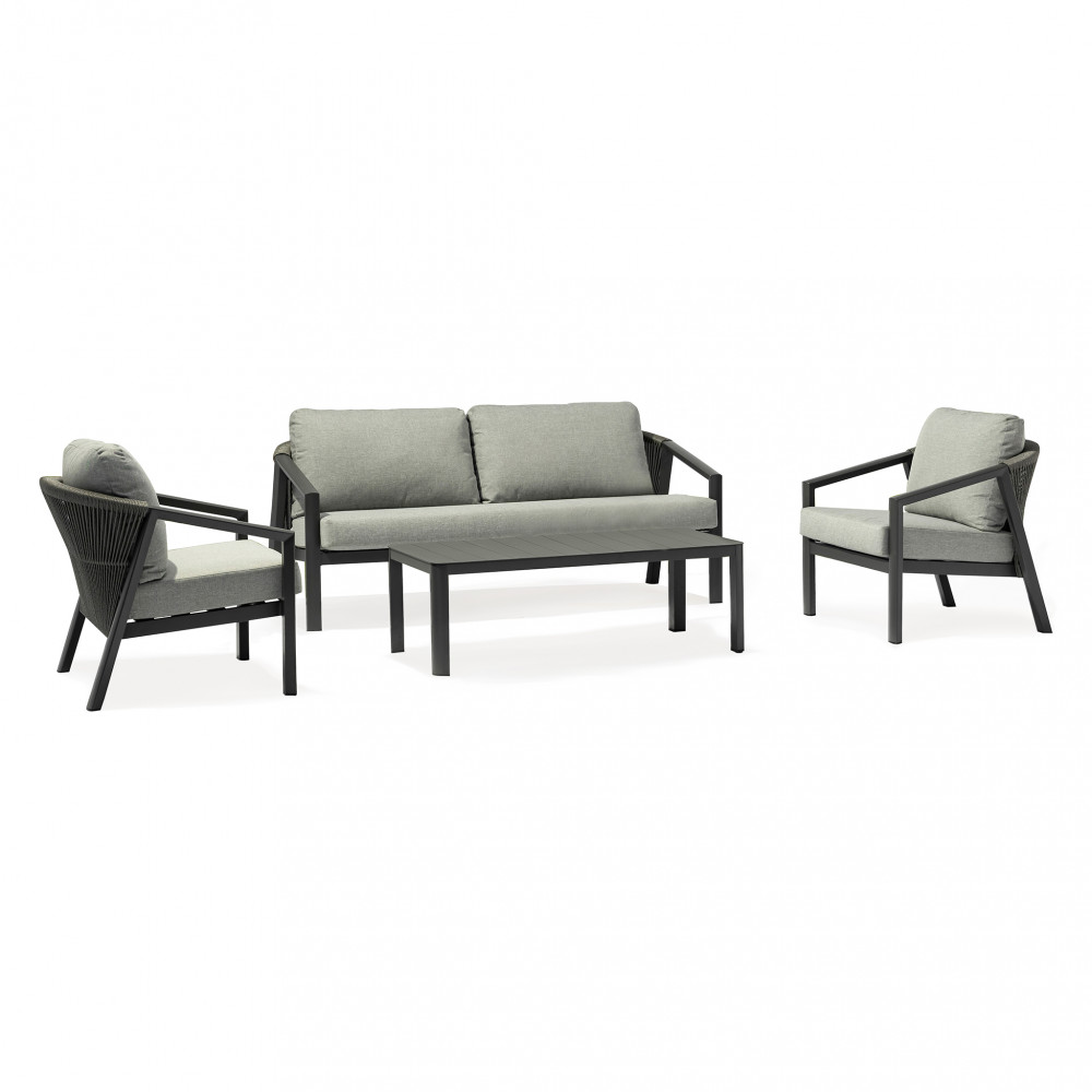 Salotto outdoor dal design essenziale e contemporaneo, con struttura in alluminio e schienale in corda intrecciata. I cuscini sfoderabili offrono comfort e praticità. Subito pronto all’uso, è ideale per arredare con stile terrazze e giardini.