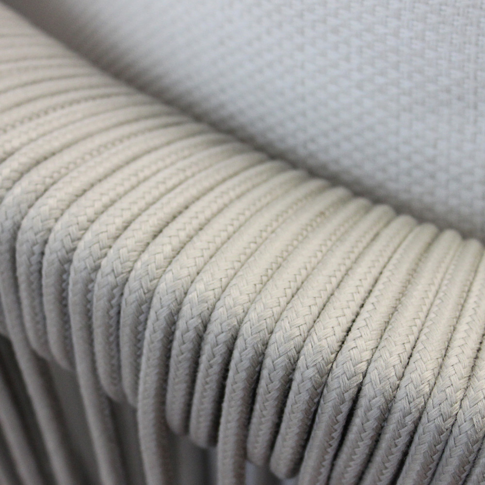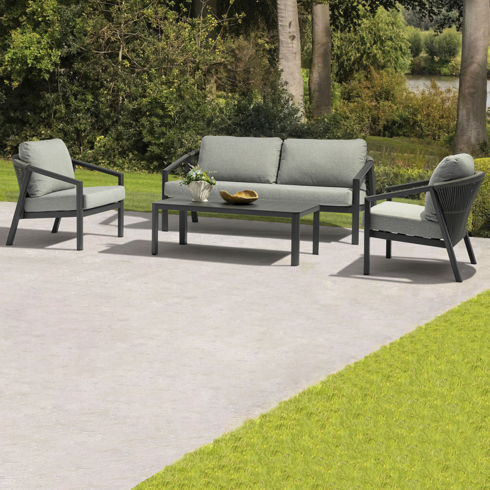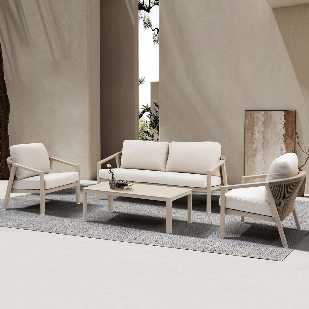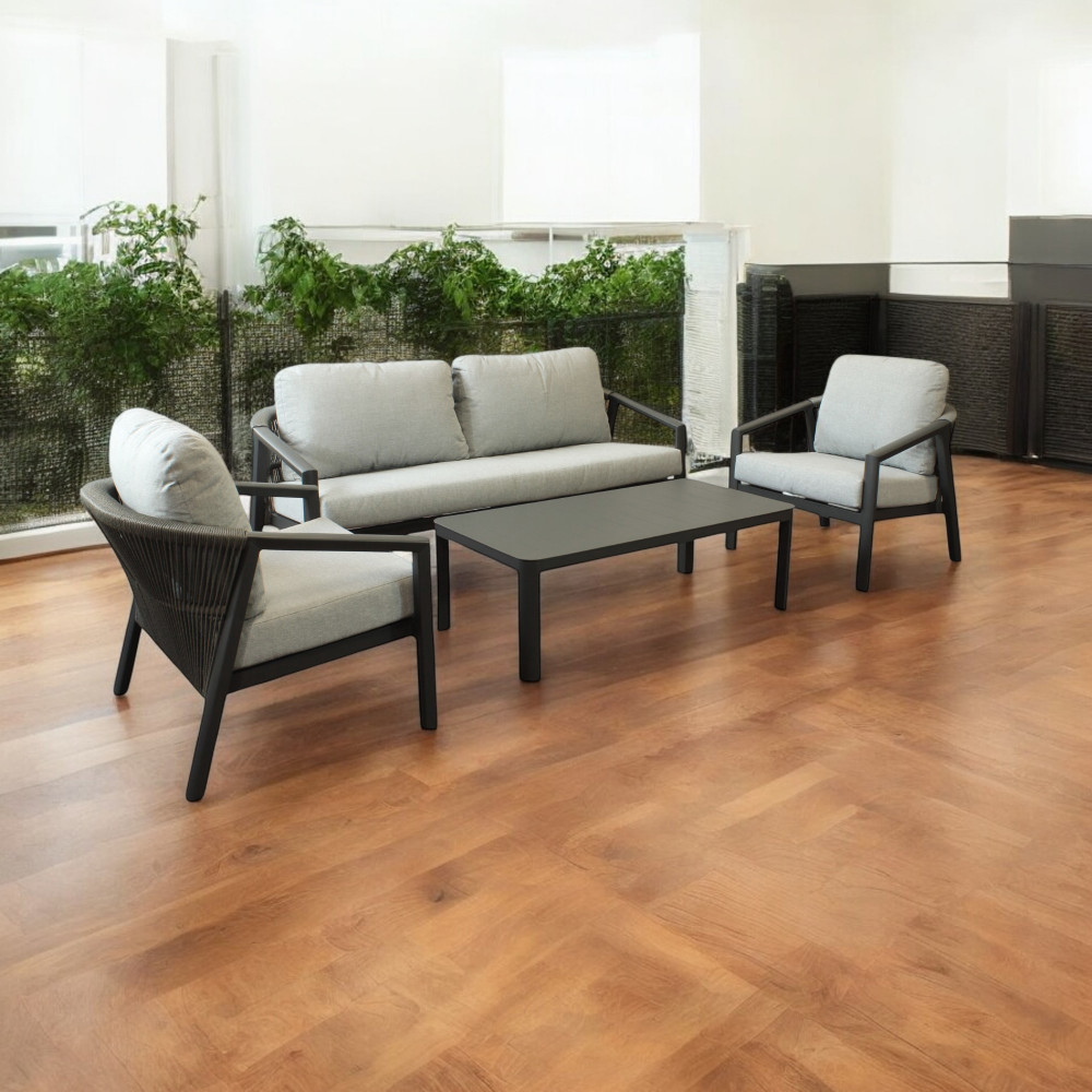 Salotto outdoor dal design essenziale e contemporaneo, con struttura in alluminio e schienale in corda intrecciata. I cuscini sfoderabili offrono comfort e praticità. Subito pronto all’uso, è ideale per arredare con stile terrazze e giardini.