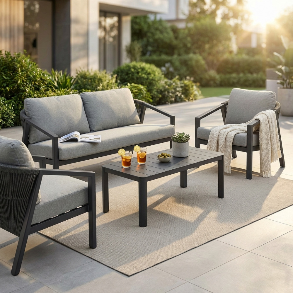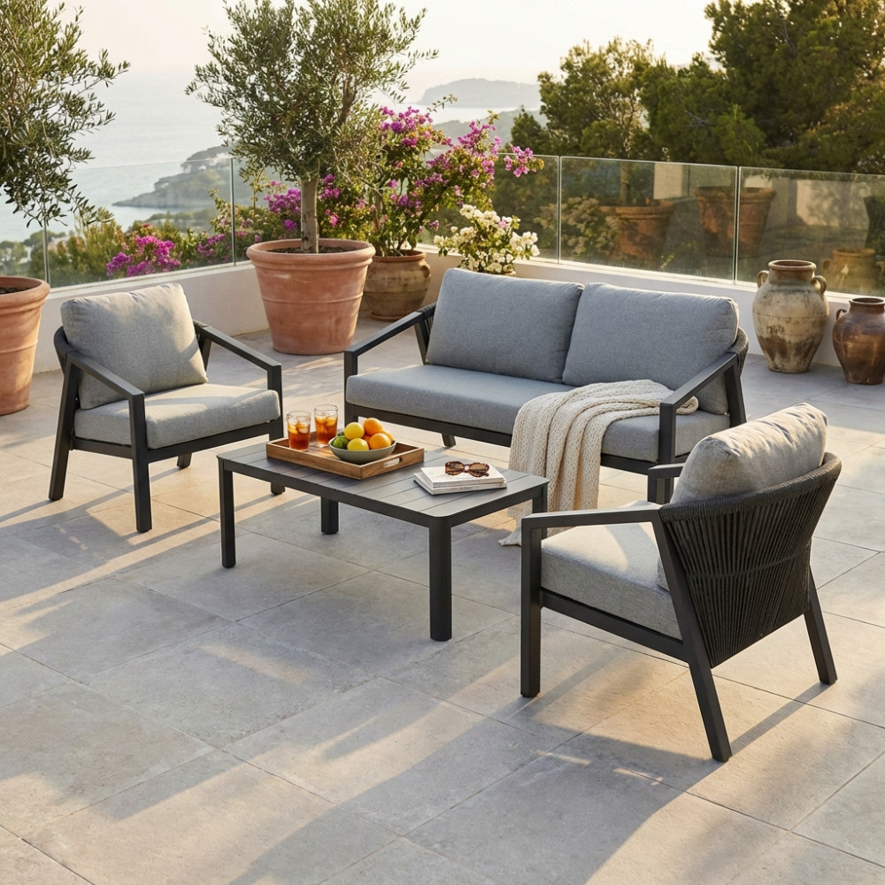 Con questo salotto da esterno, il relax trova finalmente il suo spazio ideale. Progettato per valorizzare qualsiasi area all’aperto, unisce comfort, stile e praticità. La struttura in alluminio assicura solidità e resistenza agli agenti atmosferici, mentre lo schienale in corda intrecciata in textilene aggiunge un tocco artigianale dal design attuale.