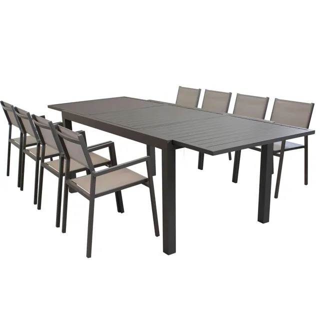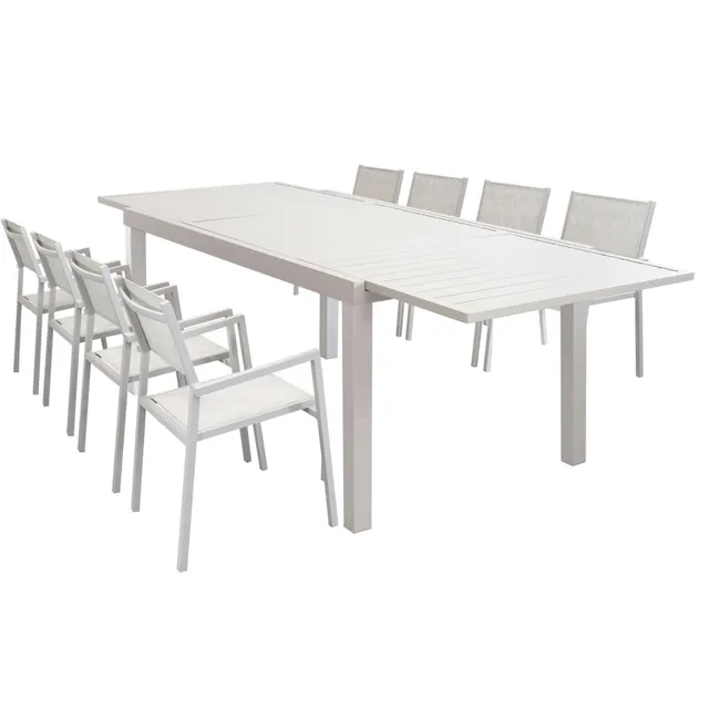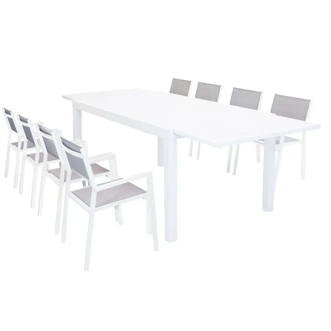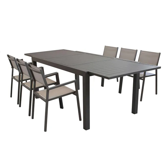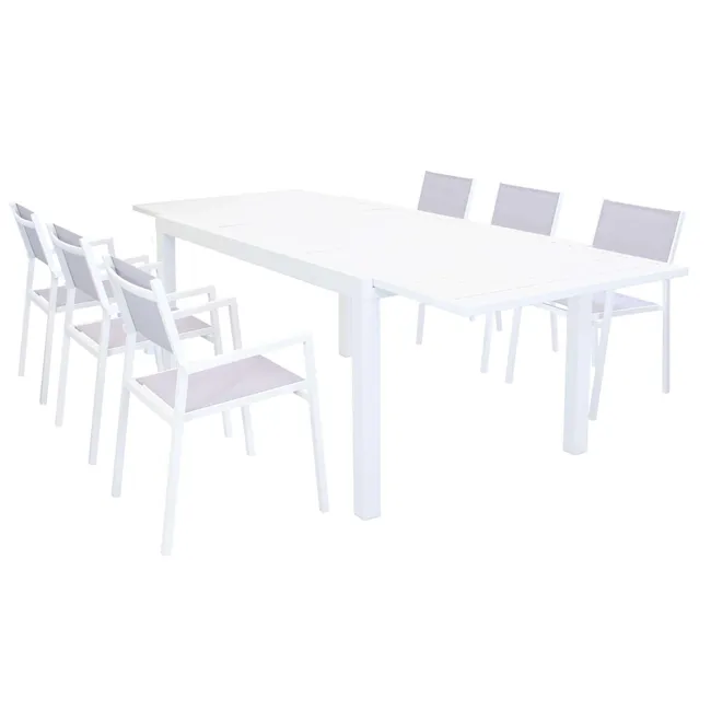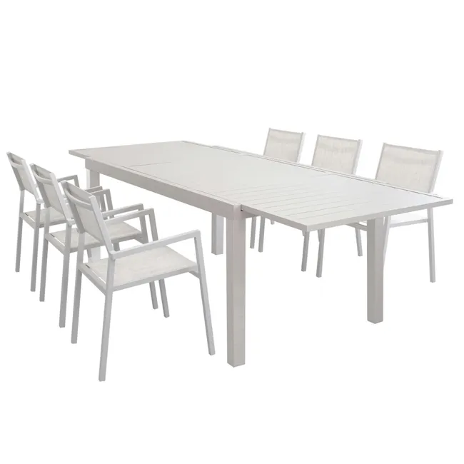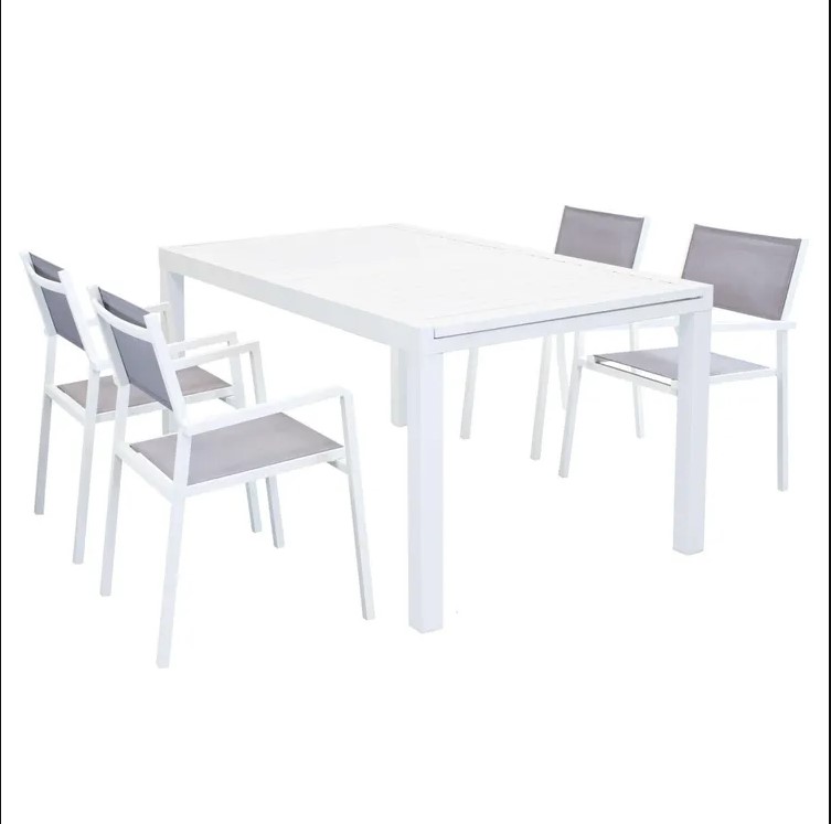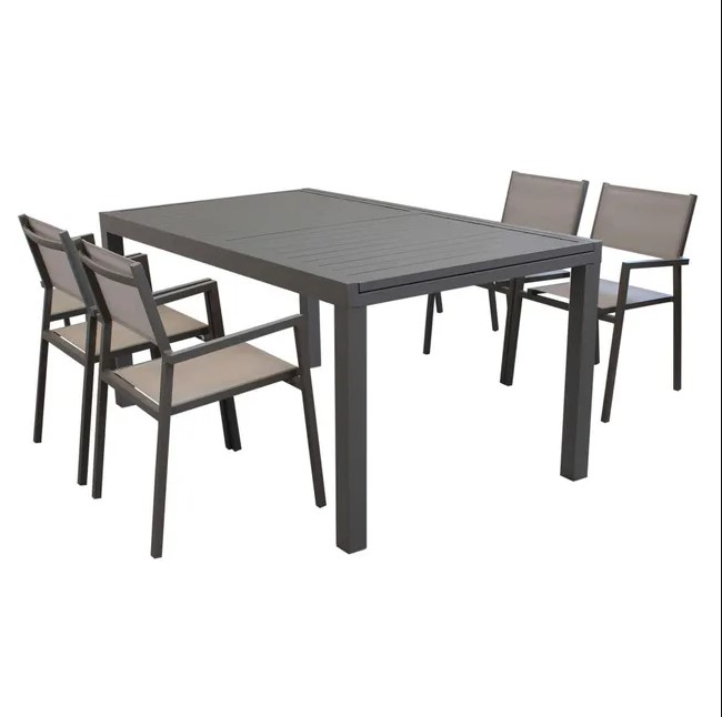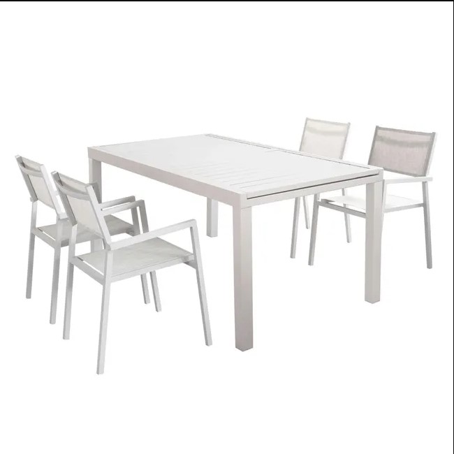 Set Tavolo Allungabile 160/240 compreso di sedute. La struttura del tavolo è in Alluminio, le sedute sono in alluminio verniciato con seduta e schienale in textilene