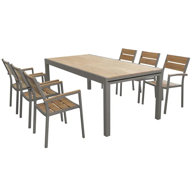 Set Tavolo Allungabile Cay 160/240, compreso di sedute. Il tavolo ha la struttura In Alluminio e il piano in Polywood color TEAK, le sedie hanno la truttura in alluminio e la seduta e lo schienale in polywood color TEAK .