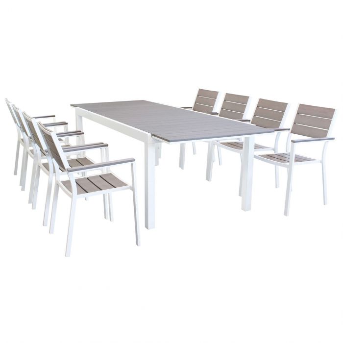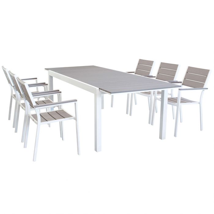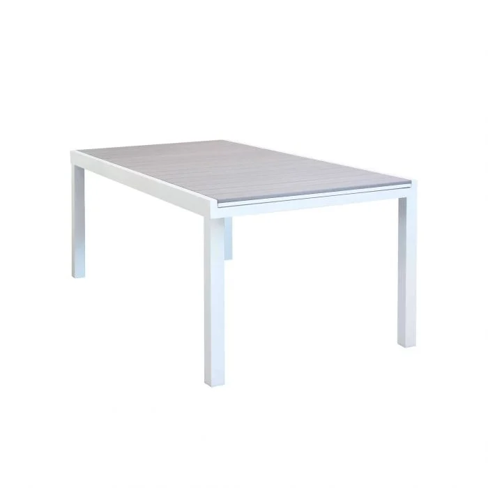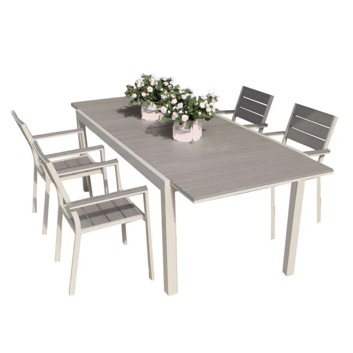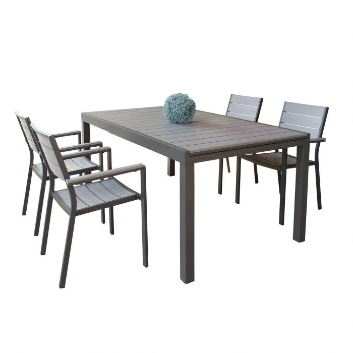 Set Tavolo Allungabile Pent 180/240 compreso di sedute. La struttura del tavolo è in Alluminio, piano del tavolo in POLYWOOD, le sedute sono in alluminio verniciato con seduta e schienale con doghe in POLYWOOD