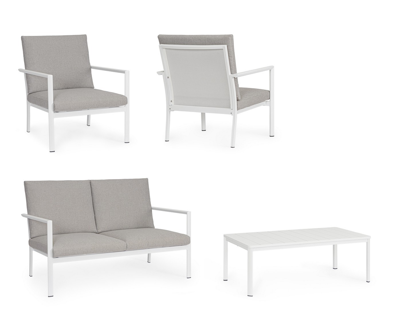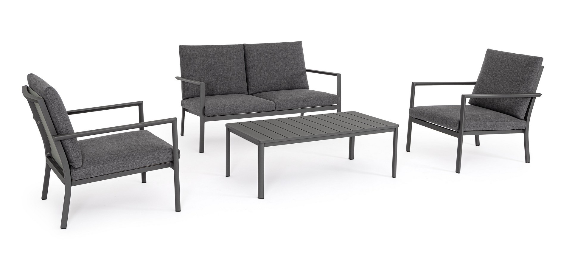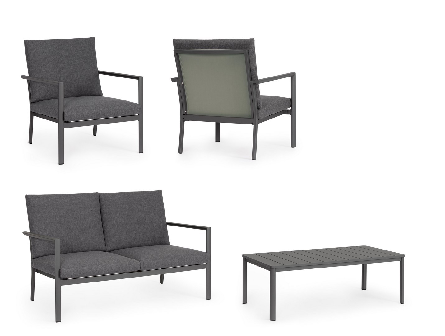 Struttura in alluminio verniciata a polvere (poliestere).  La seduta e lo schienale sono in textilene 1×1. I cuscini della seduta e dello schienale sono sfoderabili con tessuto idrorepellente olefin (100% polipropilene).