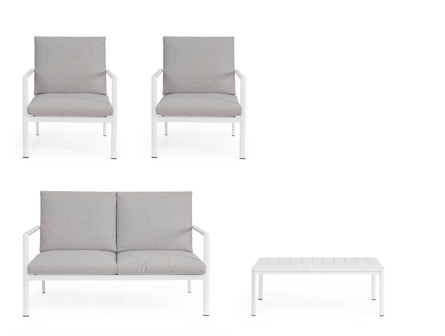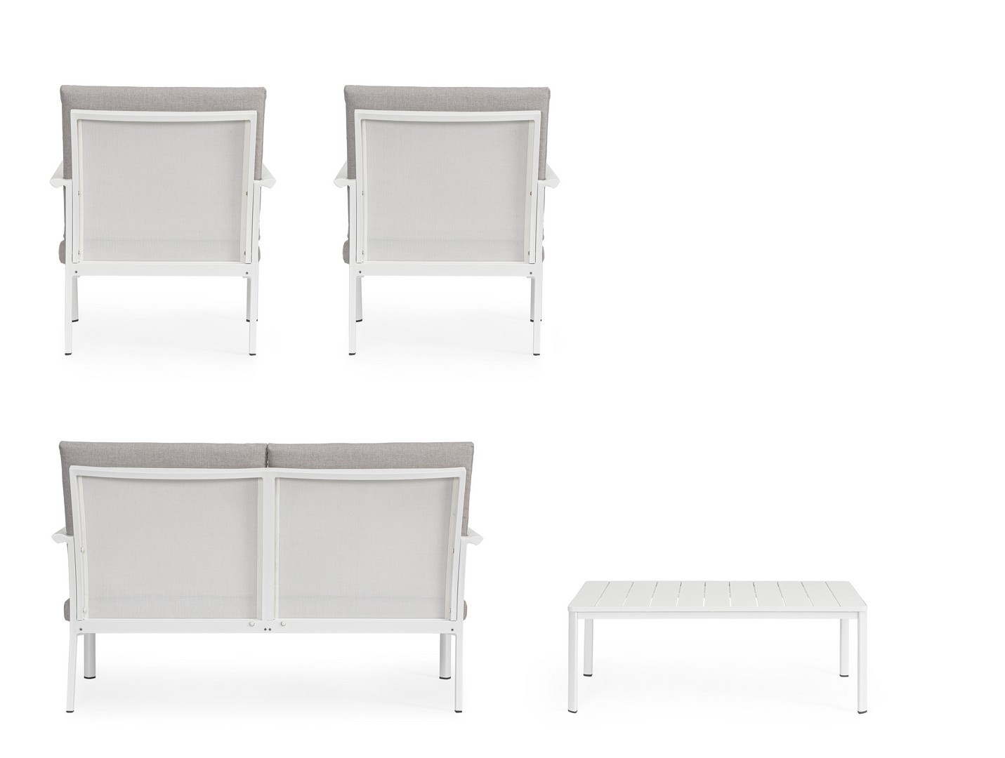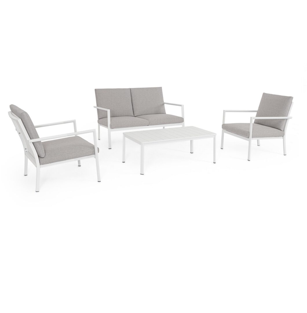 Struttura in alluminio verniciata a polvere (poliestere).  La seduta e lo schienale sono in textilene 1×1. I cuscini della seduta e dello schienale sono sfoderabili con tessuto idrorepellente olefin (100% polipropilene).