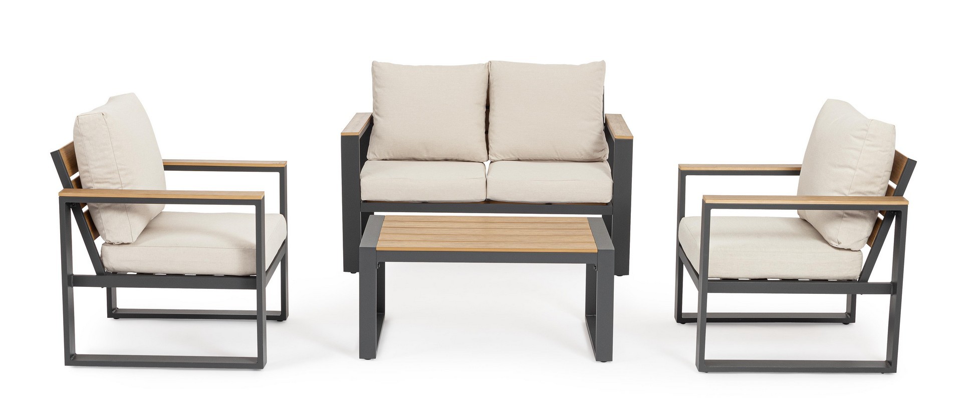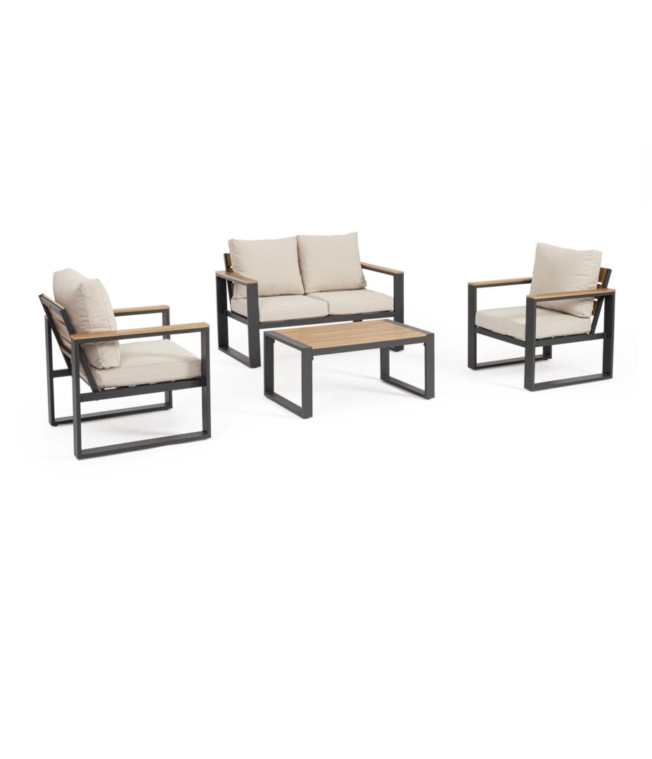 Struttura in alluminio verniciata a polvere (poliestere). I braccioli con inserti in polywood (materiale composito dall’aspetto simile al legno). La seduta e lo schienale sono in alluminio e polywood.. I cuscini sono sfoderabili con tessuto idrorepellente spun poly (220gr/m2) . Tavolino in alluminio con doghe piano in polywood. Viteria in acciaio zincato.