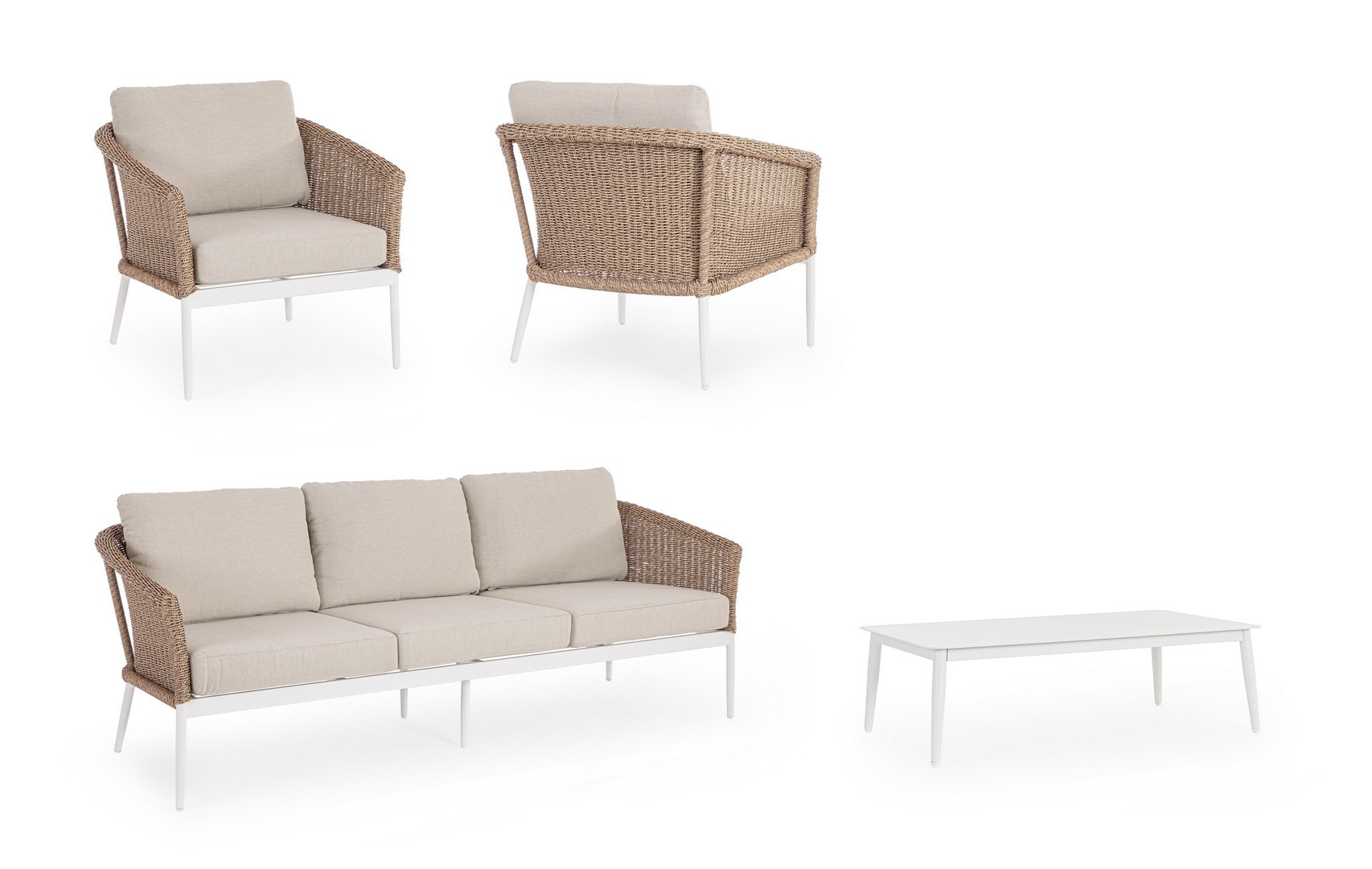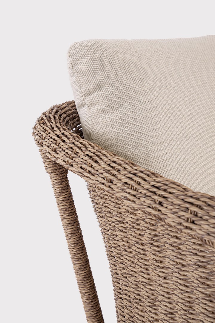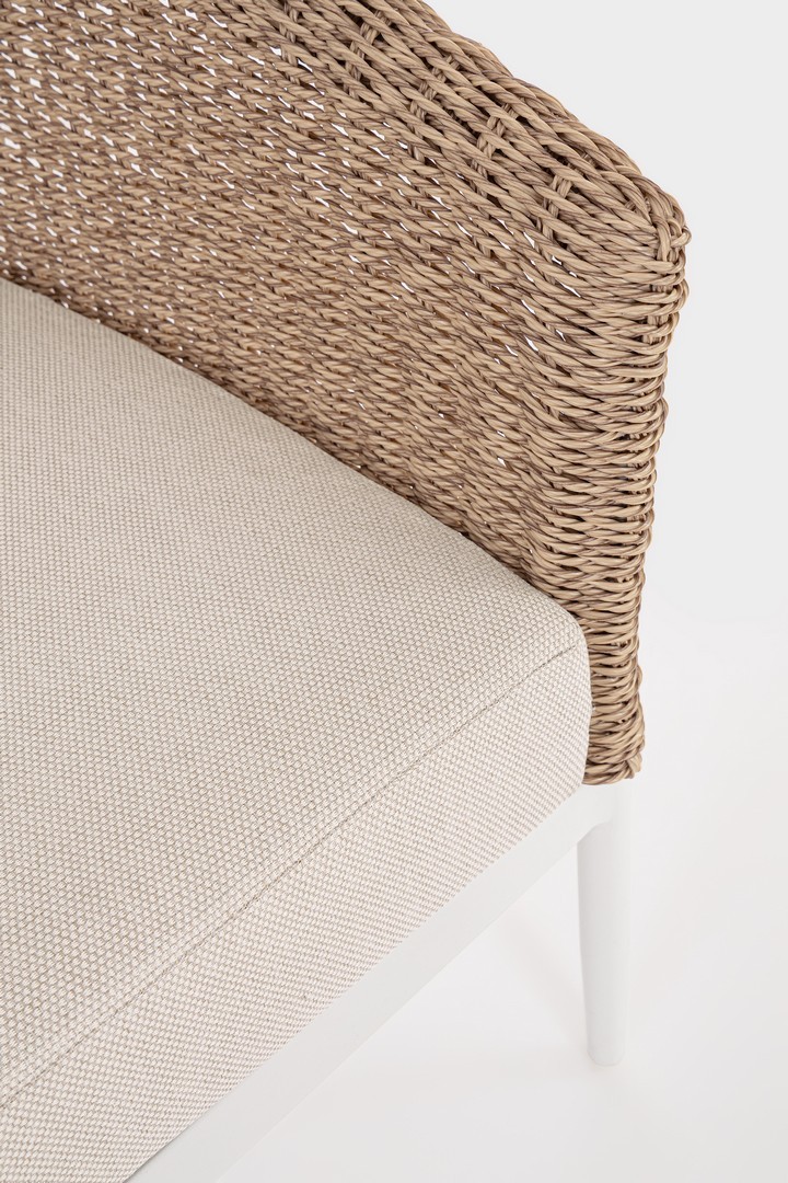 Struttura in alluminio verniciata a polvere (poliestere). La seduta è rivestita in fibra sintetica tonda (3,5 mm) . I cuscini seduta e schienale  sfoderabili con tessuto idrorepellente olefin (100% polipropilene) . Viteria in acciaio inossidabile.