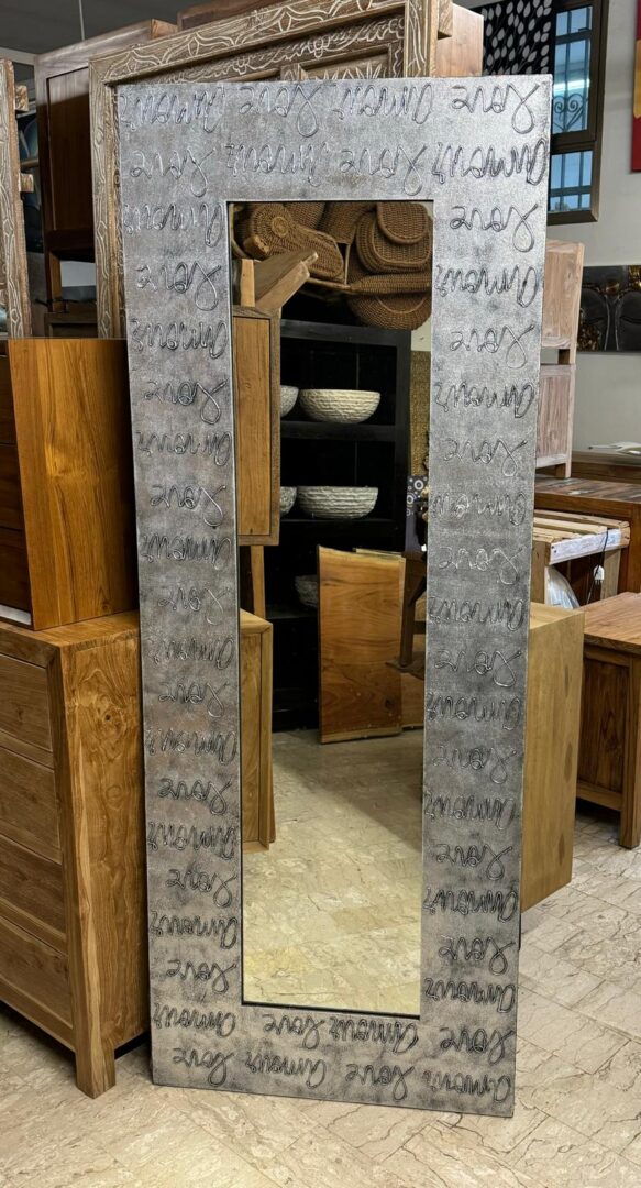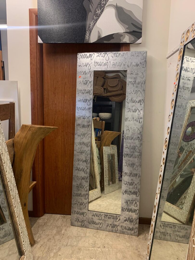 Meraviglioso specchio in legno colore argento con scritte nella cornice… Specchio artigianale fatto e lavorato interamente a mano, proveniente dall’Indonesia. Questo specchio può essere fissato o semplicemente appoggiato contro una parete, è perfetto per arredare l’ingresso di casa, la camera da letto, il soggiorno o l’ufficio in stile etnico-moderno.