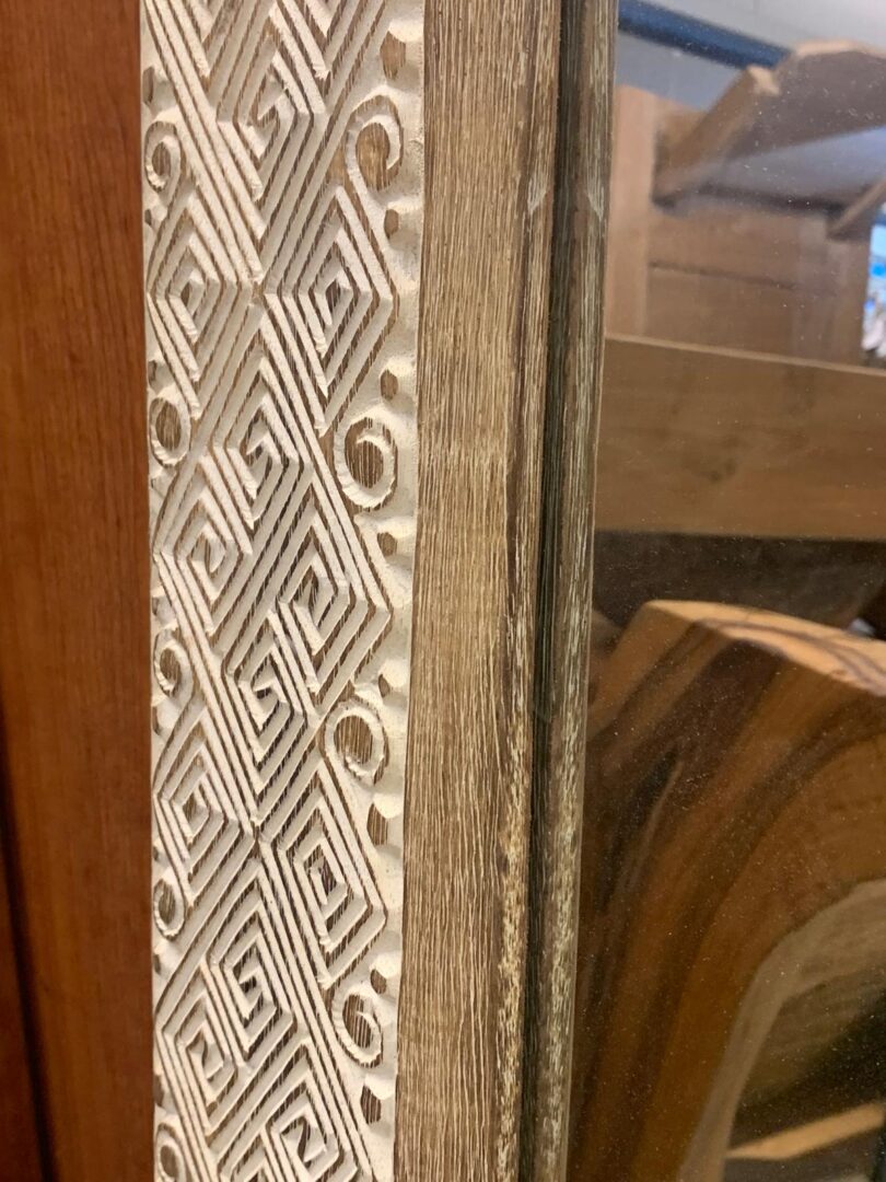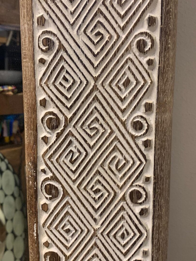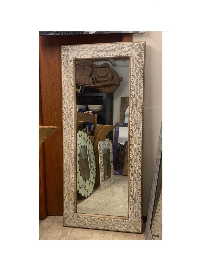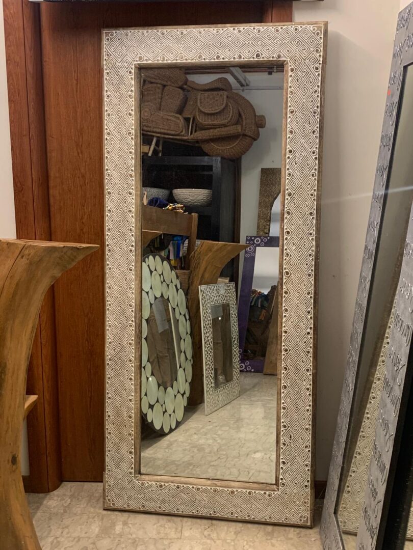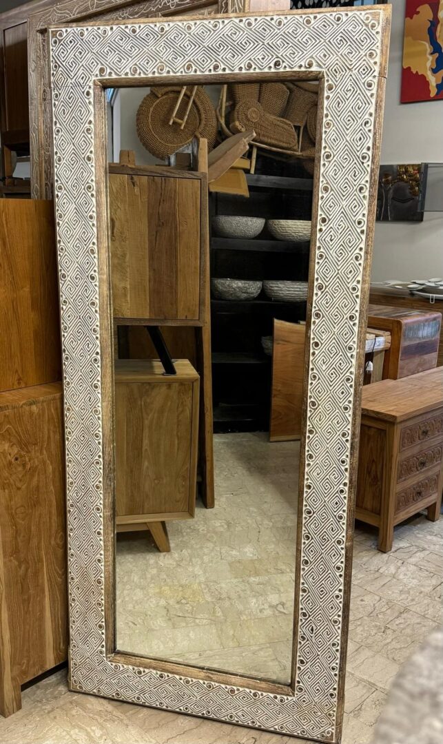 Meraviglioso specchio in legno massello intarsiato.. Specchio artigianale fatto e lavorato interamente a mano, proveniente dall’Indonesia. Questo specchio può essere fissato o semplicemente appoggiato contro una parete, è perfetto per arredare l’ingresso di casa, la camera da letto, il soggiorno o l’ufficio in stile etnico. Intarsi decapati bianchi.
