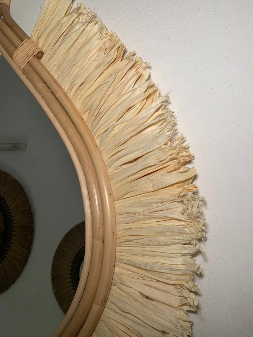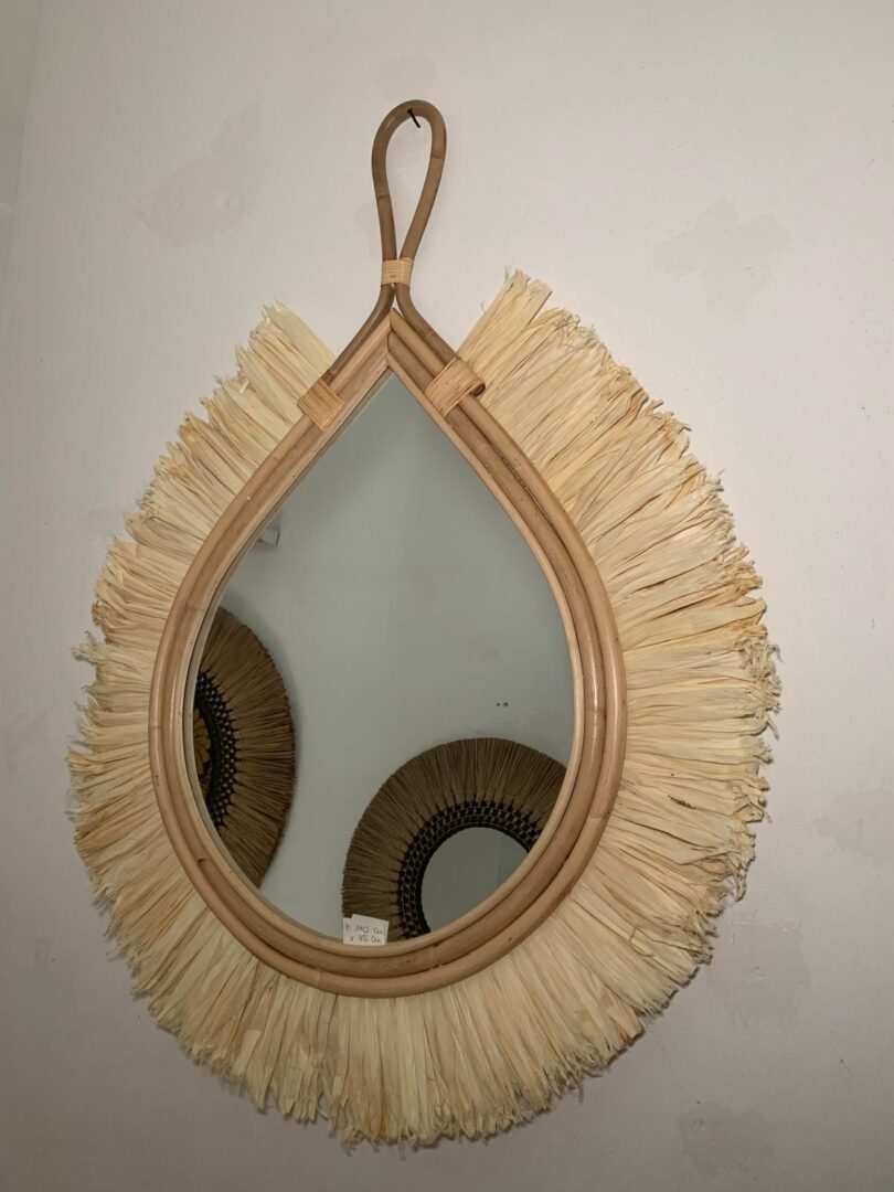 Meraviglioso specchio a forma di goccia in midollino e paglia.. Specchio artigianale fatto interamente a mano, proveniente dall’Indonesia. Questo specchio può essere fissato o semplicemente appoggiato contro una parete, è perfetto per arredare l’ingresso di casa, la camera da letto, il soggiorno o l’ufficio.