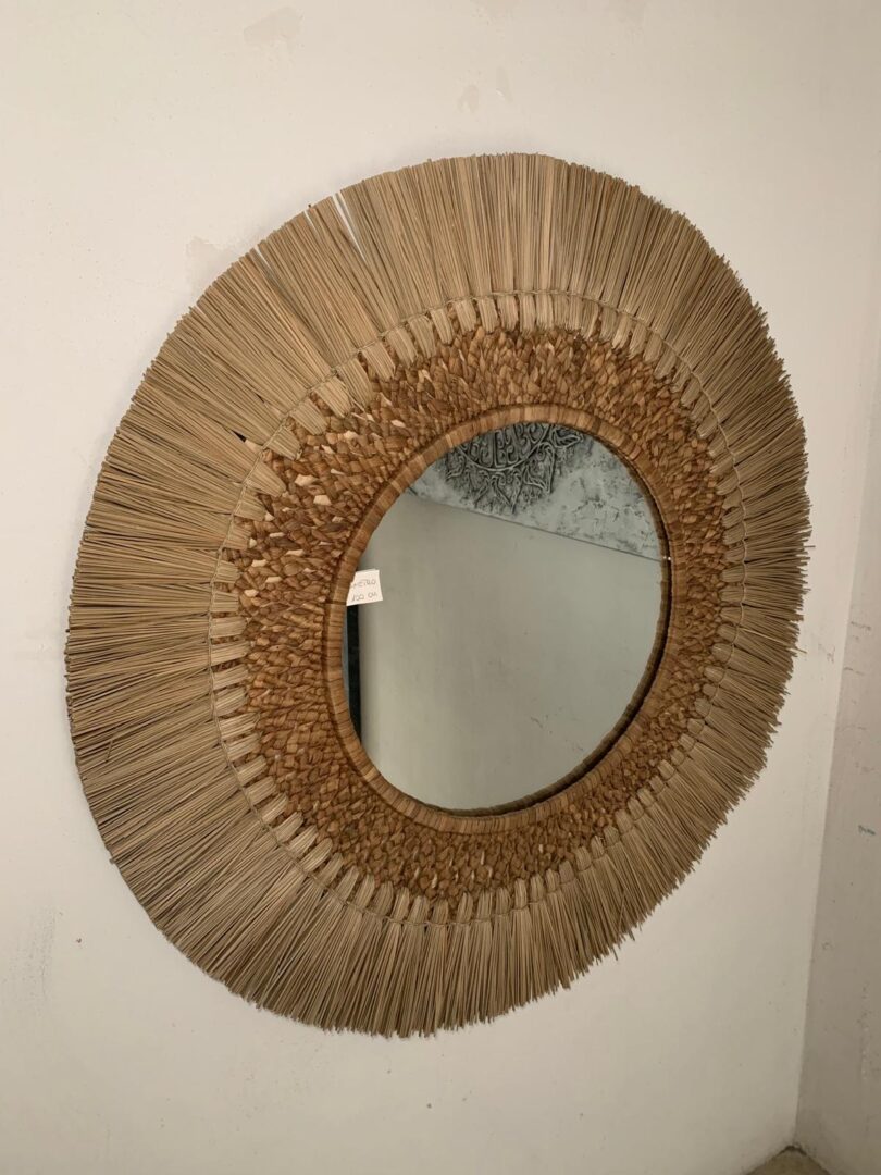 Meraviglioso specchio a forma di sole in fibra vegetali. Specchio artigianale fatto interamente a mano, proveniente dall’Indonesia. Questo specchio può essere fissato o semplicemente appoggiato contro una parete, è perfetto per arredare l’ingresso di casa, la camera da letto, il soggiorno o l’ufficio.
