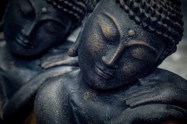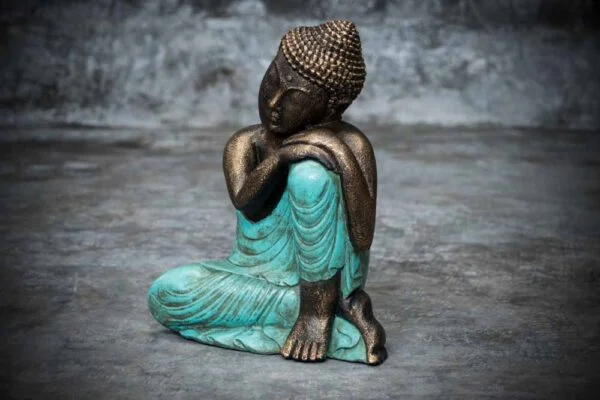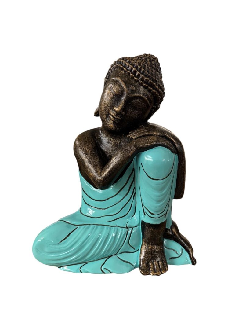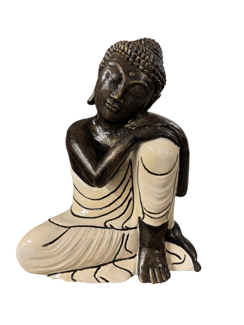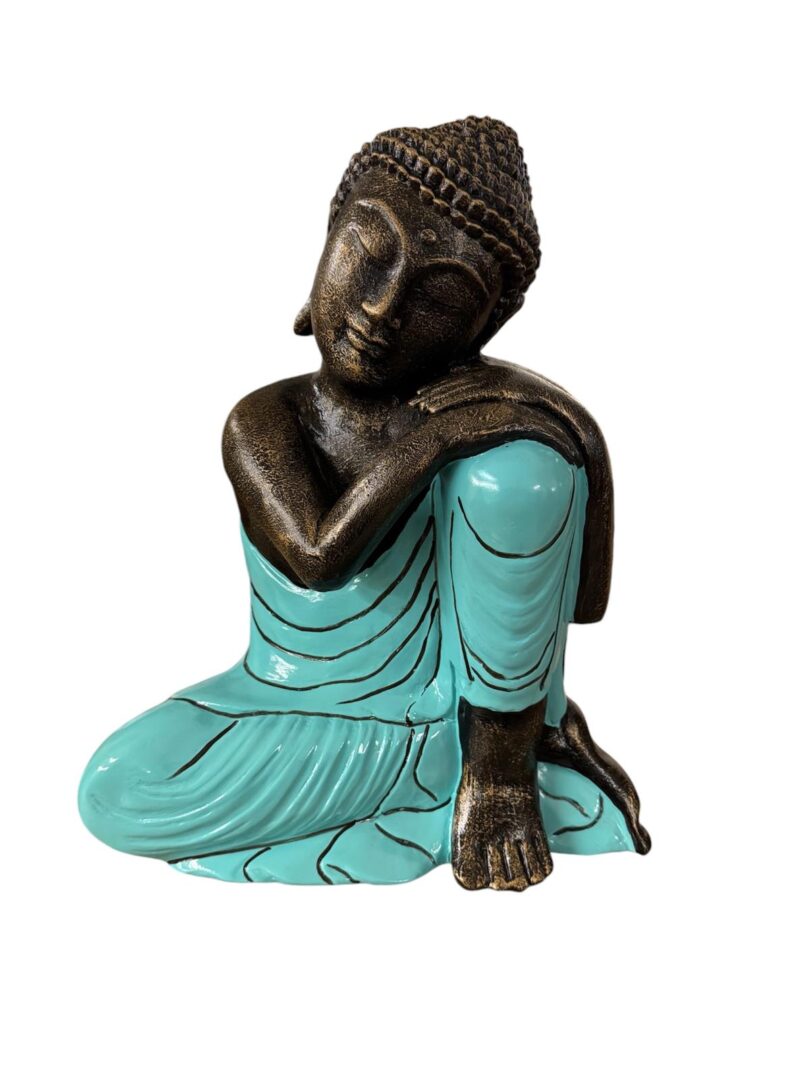 Statua Buddha 42 , Buddha che appoggia la testa sul ginocchio. Realizzato in una miscela di sabbia lavica naturale e acciaio in fibra. Finitura dipinta a mano disponibile in varie opzioni di colore.. Prodotto artiginale fatto interamente a mano.