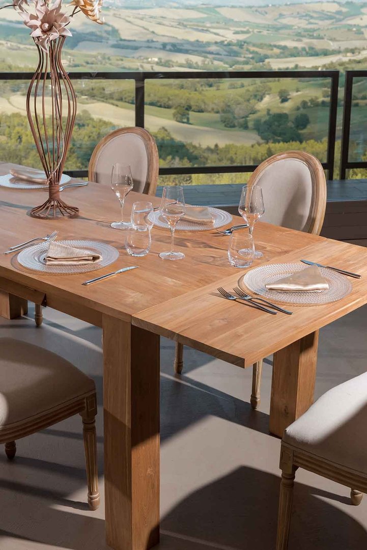 Il tavolo allungabile in legno massello di teak naturale rappresenta un connubio perfetto tra eleganza, funzionalità e resistenza. Realizzato con legno di teak di alta qualità, questo tavolo si distingue per la sua superficie liscia e naturale, che mette in risalto le venature uniche del legno. Il teak, noto per la sua durabilità e resistenza agli agenti atmosferici, è ideale per essere utilizzato sia in ambienti interni che esterni.
