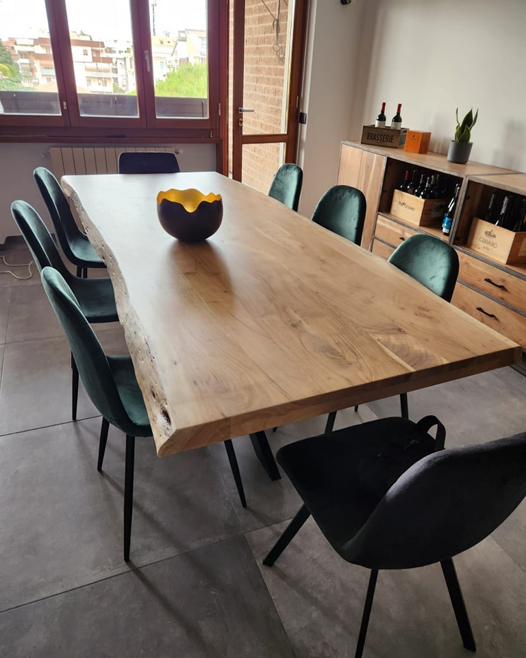 Tavolo Fisso Massello250 cm, in legno massello di acacia di produzione artigianale, realizzato interamente a mano . Finitura naturale che esalta le calde venature del legno ,gambe industrial ferro nere a stella