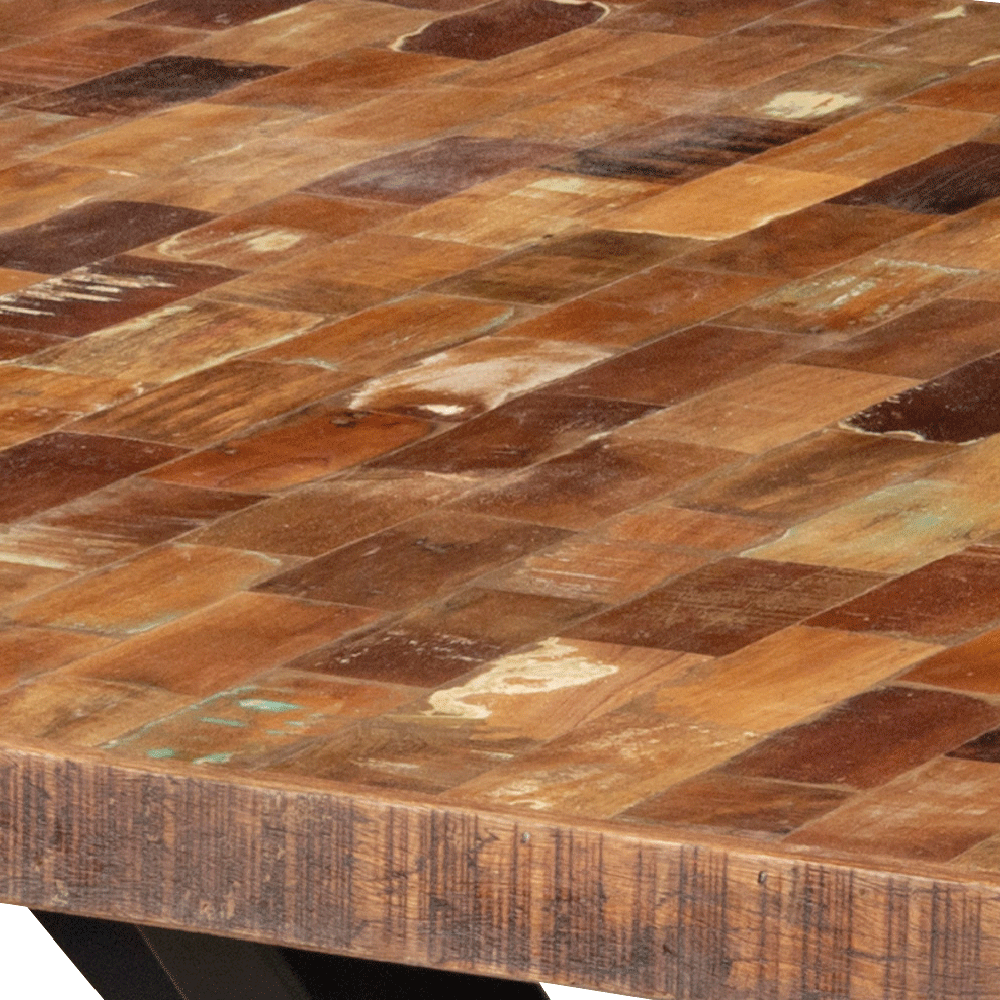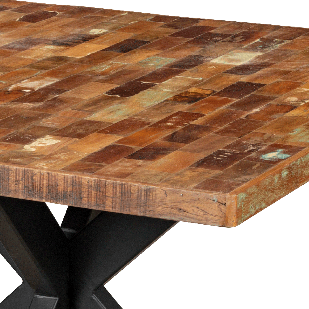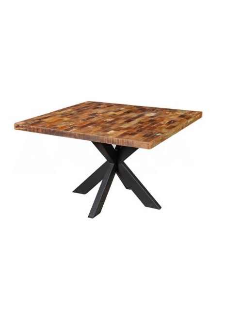 Tavolo Quadrato Recycled 120 , in legno massello riciclato di produzione artigianale, realizzato interamente a mano . Finitura naturale che esalta le calde venature del legno. Gambe a X in ferro colore nero.
