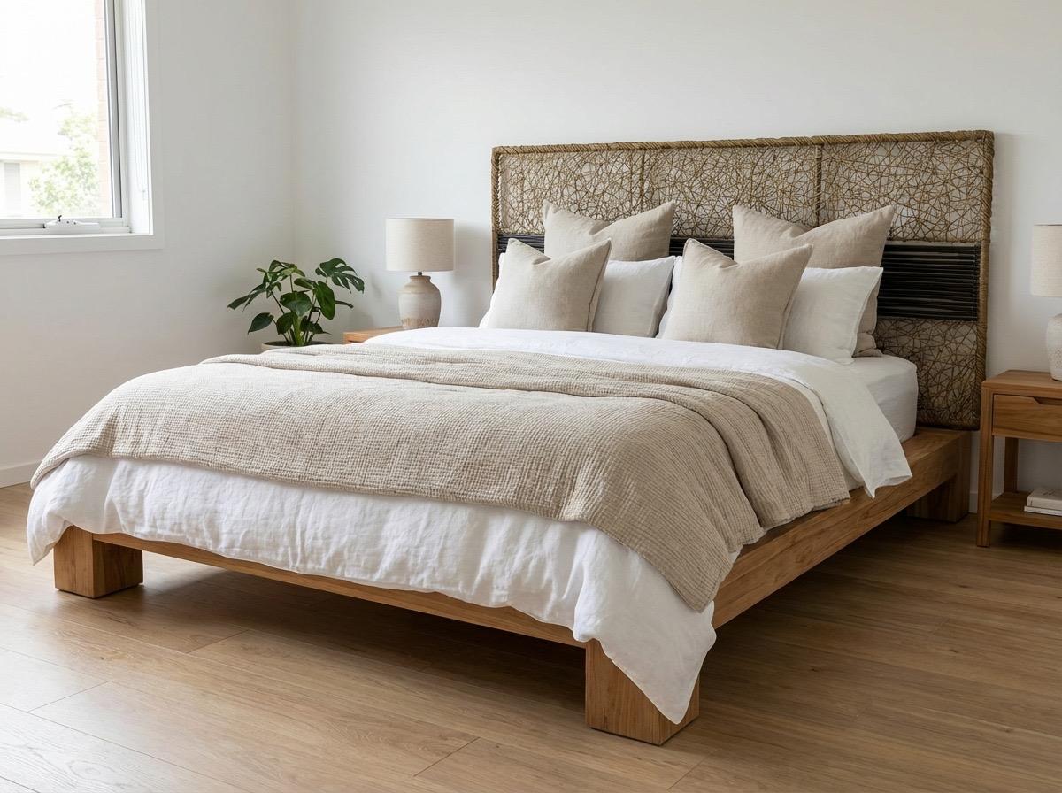 Questa testata letto rappresenta una sofisticata espressione di design etnico-chic, dove la solidità del metallo si sposa con l’eleganza vibrante delle fibre naturali.