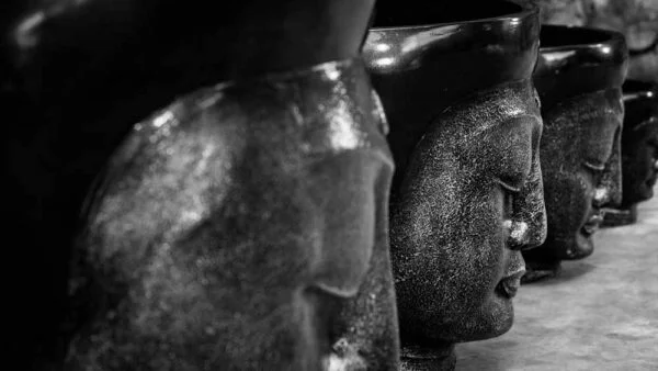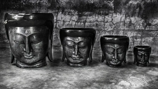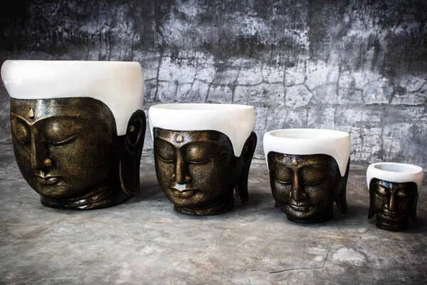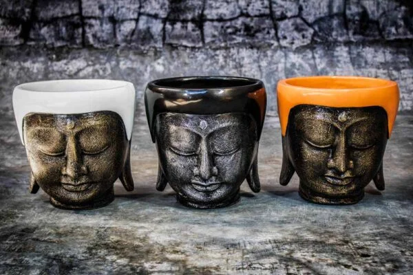 Vasi Testa Buddha , Testa di Buddha colorata da usare come vaso per fiori. Realizzata in un mix di sabbia lavica e fibre.