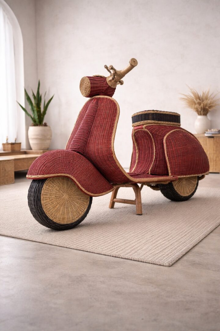 Questa straordinaria Vespa realizzata interamente in rattan rappresenta un incontro senza precedenti tra l’iconico design industriale italiano e l’eccellenza dell’artigianato manuale.