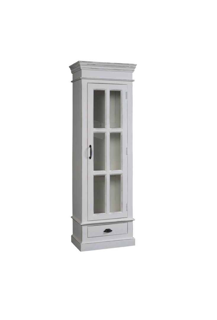Composta da 1 anta con vetro e 1 cassetto con maniglia nella parte inferiore della vetrina.