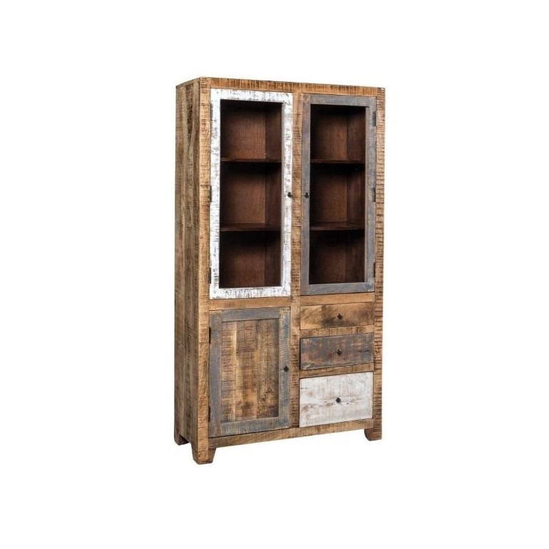 Vetrina Brest , in legno massello di mango composta da 2 ante con vertro e ripiani interni. ! anta in legno massello di mango. 3 cassetti con maniglia.