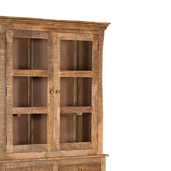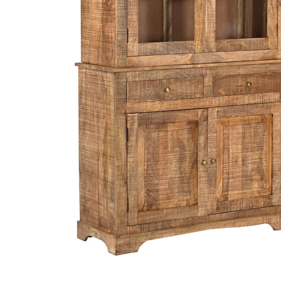 Vetrina-Credenza Antalya Doppio Corpo , in legno massello di mango composta da 2 ante con vetro e ripiani all’interno, nella parte inferiore 2 ante in legno massello naturale stile rustico e 2 cassetti.