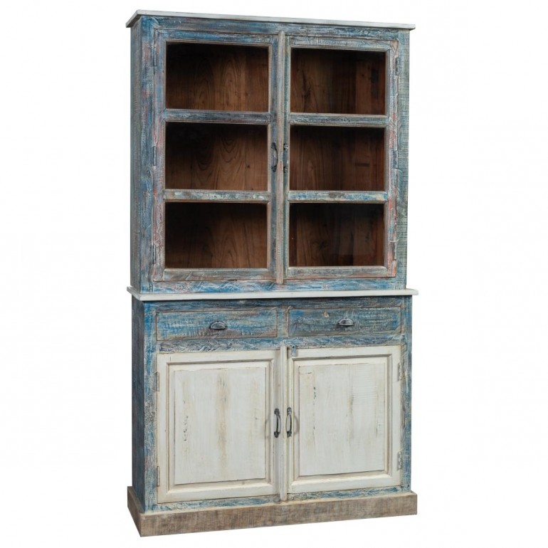 Vetrina-Credenza Biarritz Doppio Corpo , in legno massello di mango lavorato artigianalmente. Composta da 2 ante con vetro, 2 ante in legno massello e 2 cassetti con maniglia nella parte inferiore del mobile.