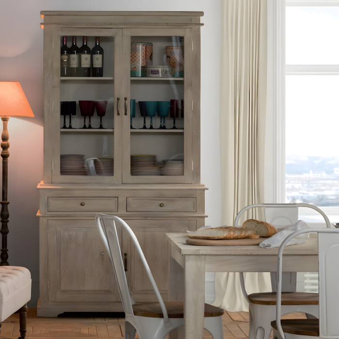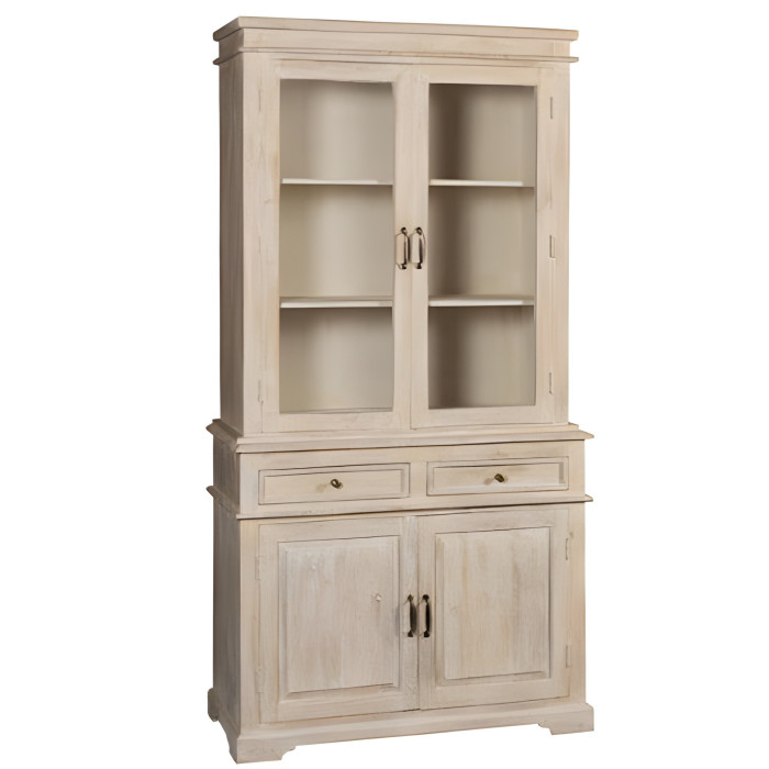 Vetrina-Credenza Cottage Doppio Corpo , in legno massello di mango lavorato artigianalmente, decapata. Composta da 2 ante con vetro, 2 ante in legno massello e 2 cassetti con maniglia nella parte inferiore del mobile.