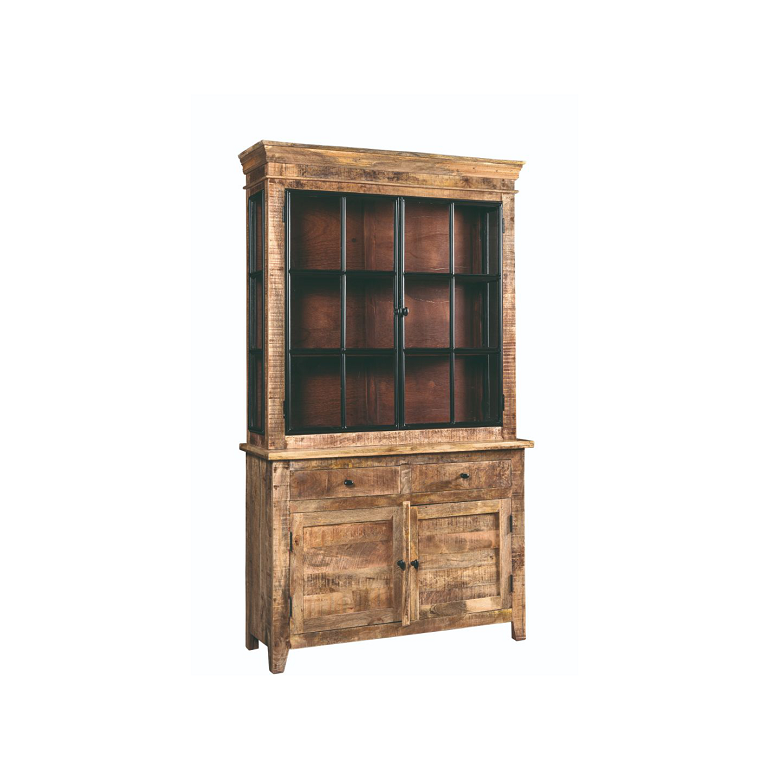Vetrina-Credenza Etienne Doppio Corpo, in legno massello di mango composta da 2 ante con vetro e ripiani all’interno, nella parte inferiore 2 ante in legno massello e 2 cassetti.