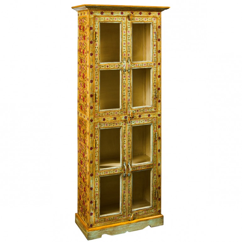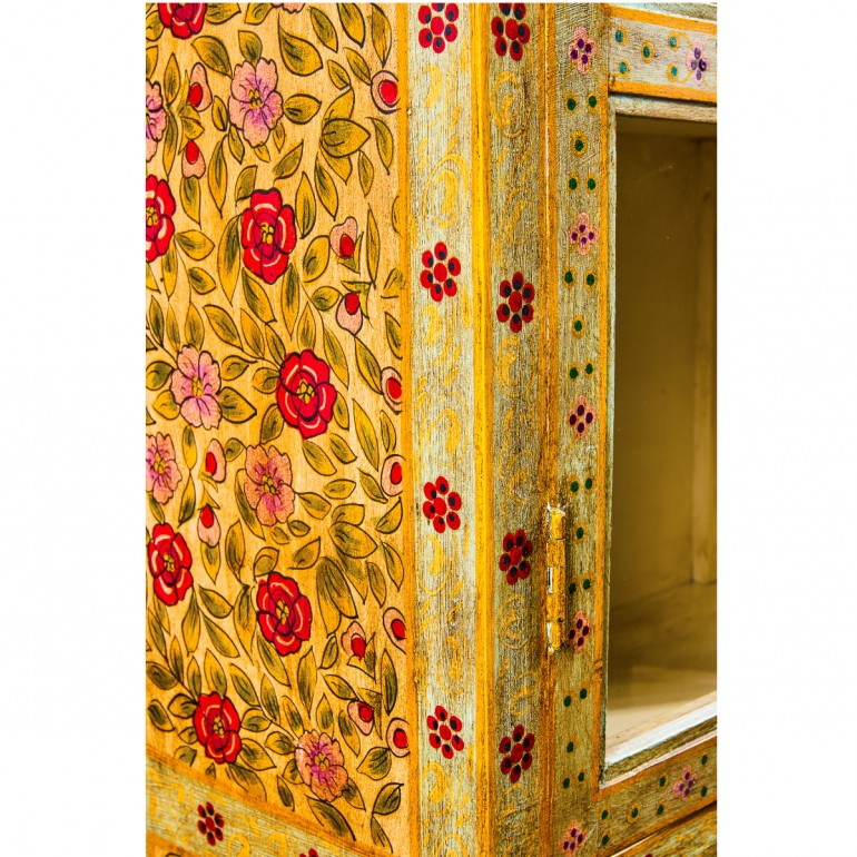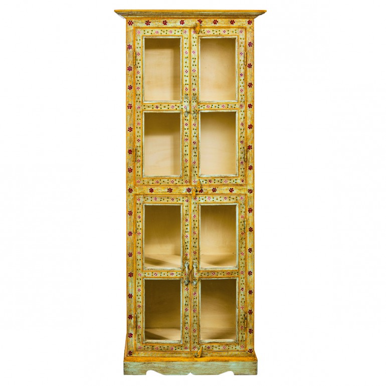 Vetrina Frida 4A Giallo , costruita interamente in legno massello di mango, e decorata a mano.