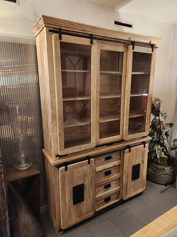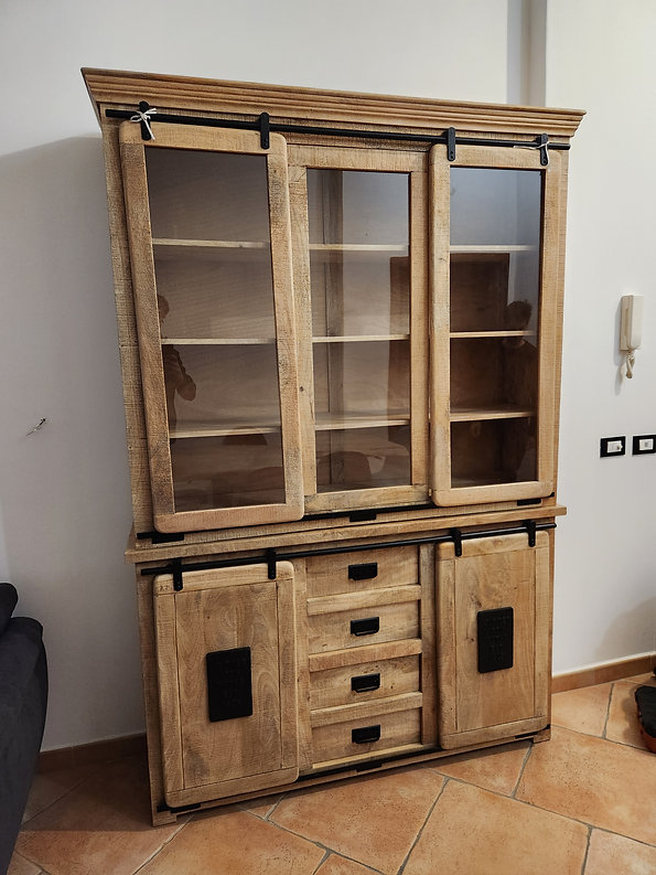 Credenza dispensa alta in legno massello con finiture in ferro battuto e ghisa. Credenza composta da 3 ante scorrevoli e 4 cassetti nella parte inferiore, 4 ante a battente nella parte superiore. Con mensole interne. Scegli di abbinarci anche le credenze disponibili in varie misure, visitando il nostro shop on line.