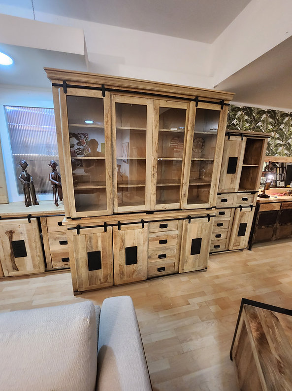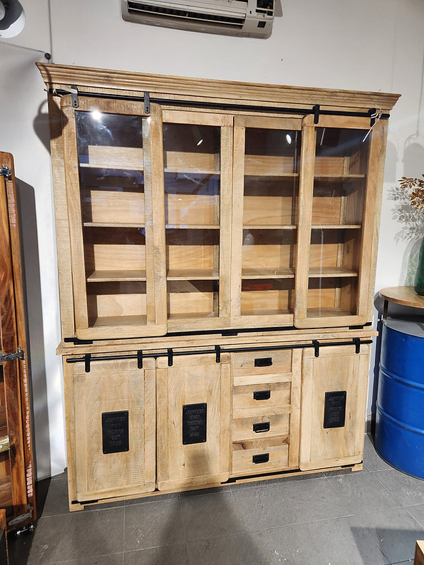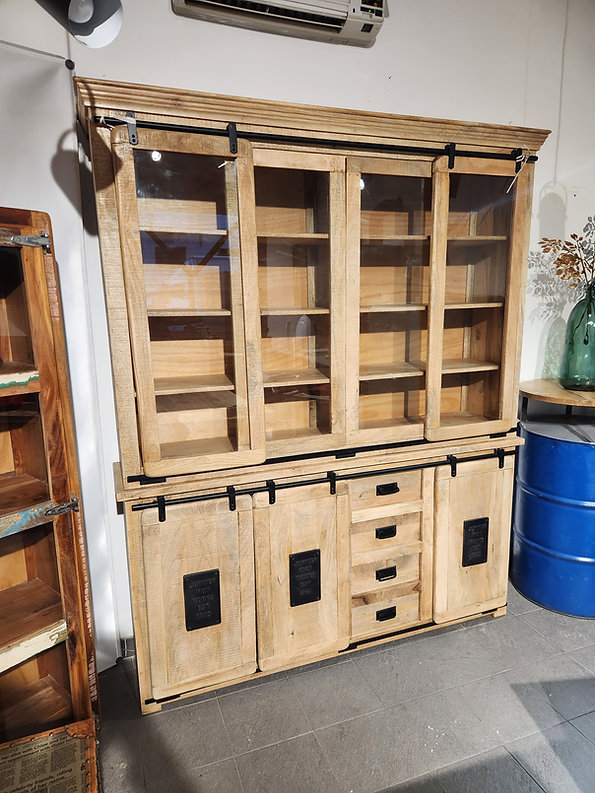 Credenza dispensa alta in legno massello con finiture in ferro battuto e ghisa. Credenza composta da 3 ante scorrevoli e 4 cassetti nella parte inferiore, 4 ante a battente nella parte superiore. Con mensole interne. Scegli di abbinarci anche le credenze disponibili in varie misure, visitando il nostro shop on line.