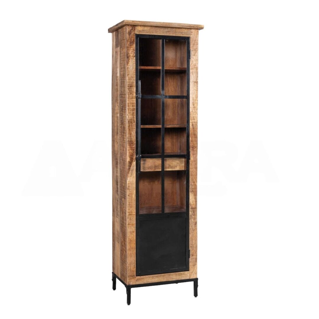 Vetrina Playmouth Apertura a Destra, vetrina etnica vintage in vero legno massello di mango, costruita interamente a mano, le ante e i piedini sono elementi realizzati in acciaio . Questa particolare vetrina è composta da 5 ripiani interni ( tre superiori più piccoli e due inferiori più ampi) e 1 anta con vetro.