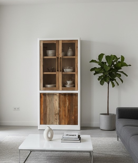 La linearità del design mette al centro la bellezza naturale del legno, rendendo la vetrina perfettamente adattabile a qualsiasi ambiente, dal classico al moderno.