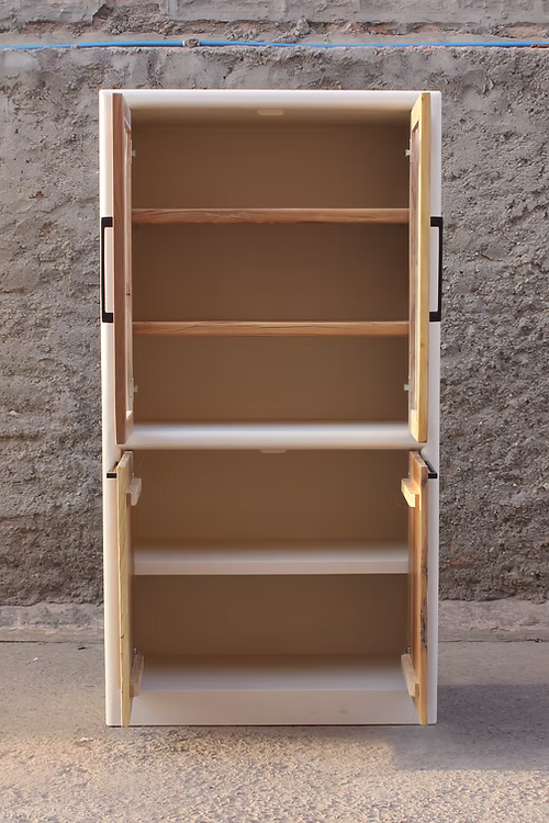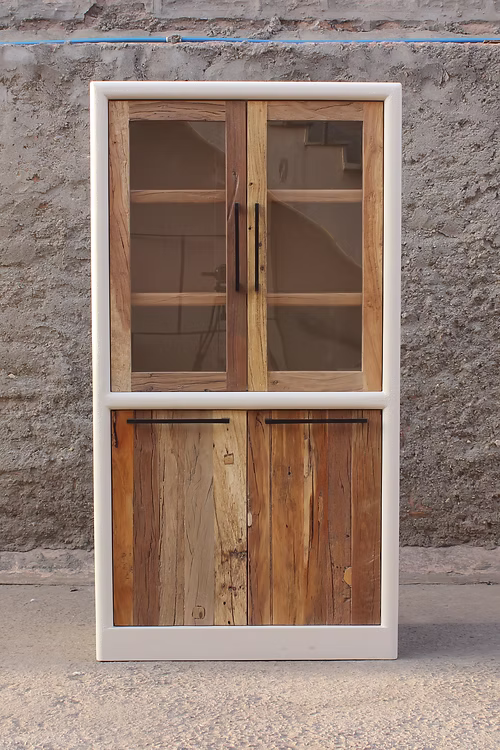 La Vetrina Roma è un mobile elegante e senza tempo, composto da due ante inferiori e due ante superiori con vetro. È realizzata in calce lavorata a mano e legno massello di quercia, materiali che ne esaltano l’autenticità e il valore artigianale.