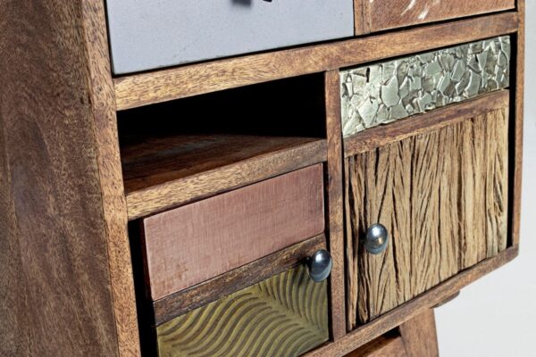 Se cerchi dei comodini originali ed unici per la tua camera da letto, ti presentiamo la linea Dhaval. La struttura di questo comodino è in legno massello di mango con inserti in acacia. Le applicazioni nelle ante e nei cassetti sono in stoffa e pelle. Questo particolare comodino è in stile vintage ma si abbina bene anche all’arredamento moderno come elemento di contrasto. La finitura è in vernice a base d’acqua e le maniglie sono in acciaio
