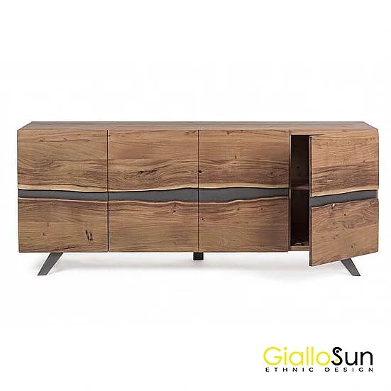 La struttura è in legno massello di acacia a cui si contrappongono dei dettagli in metallo verniciato con vernice poliuretanica antracite come le gambe a slitta e gli inserti nelle ante. Il metallo insieme alle sfumature calde del legno crea un bellissimo effetto, molto elegante e raffinato.