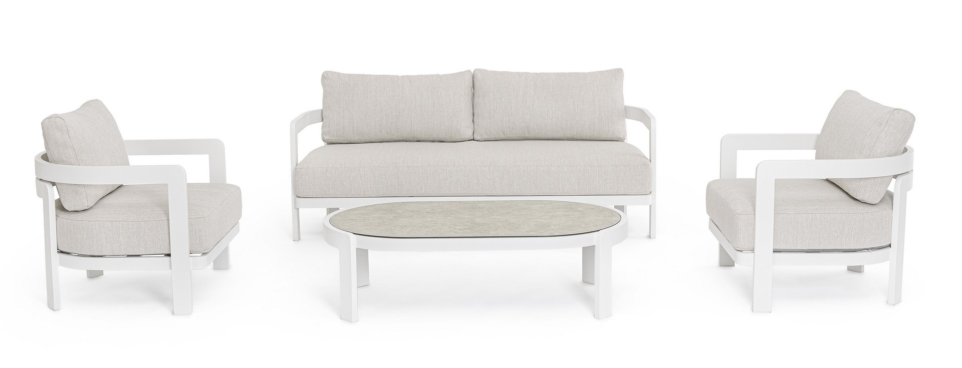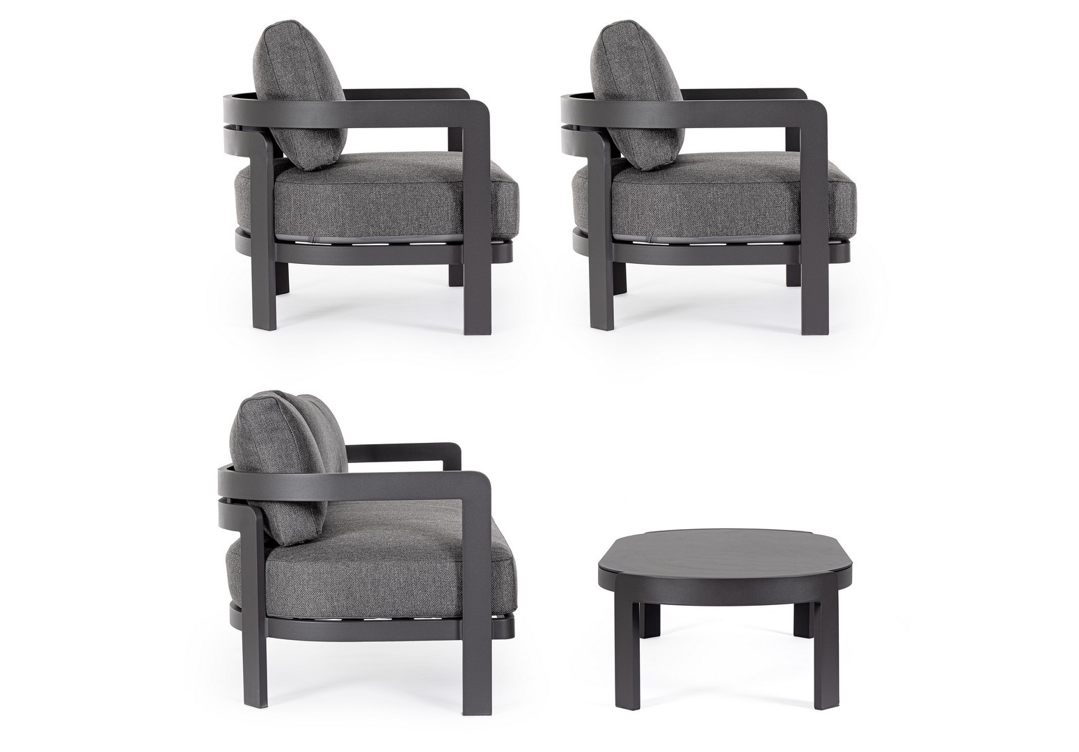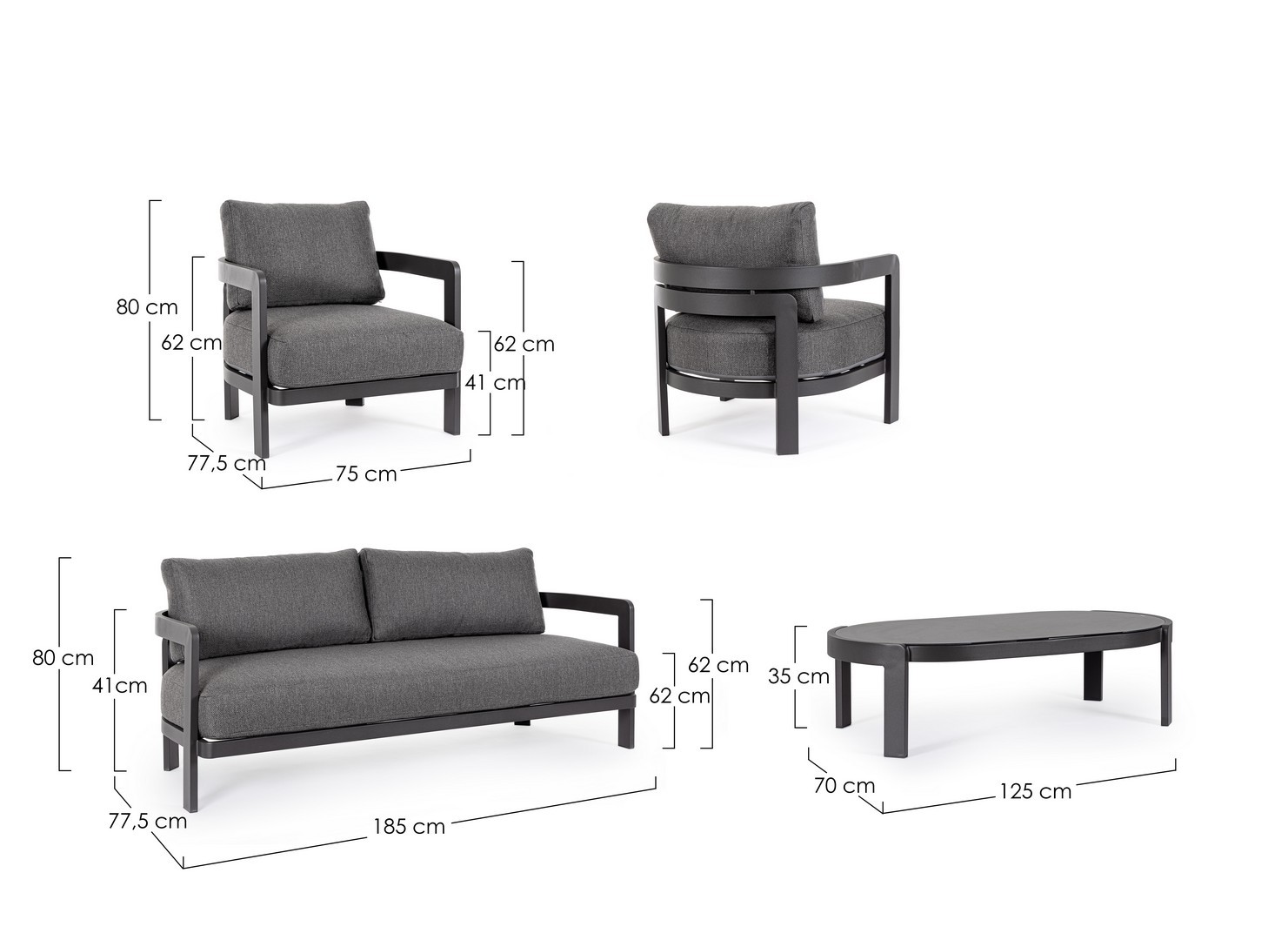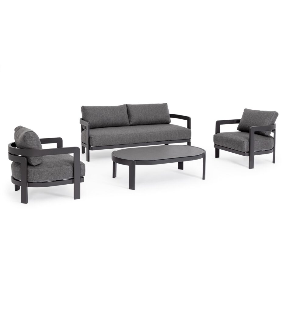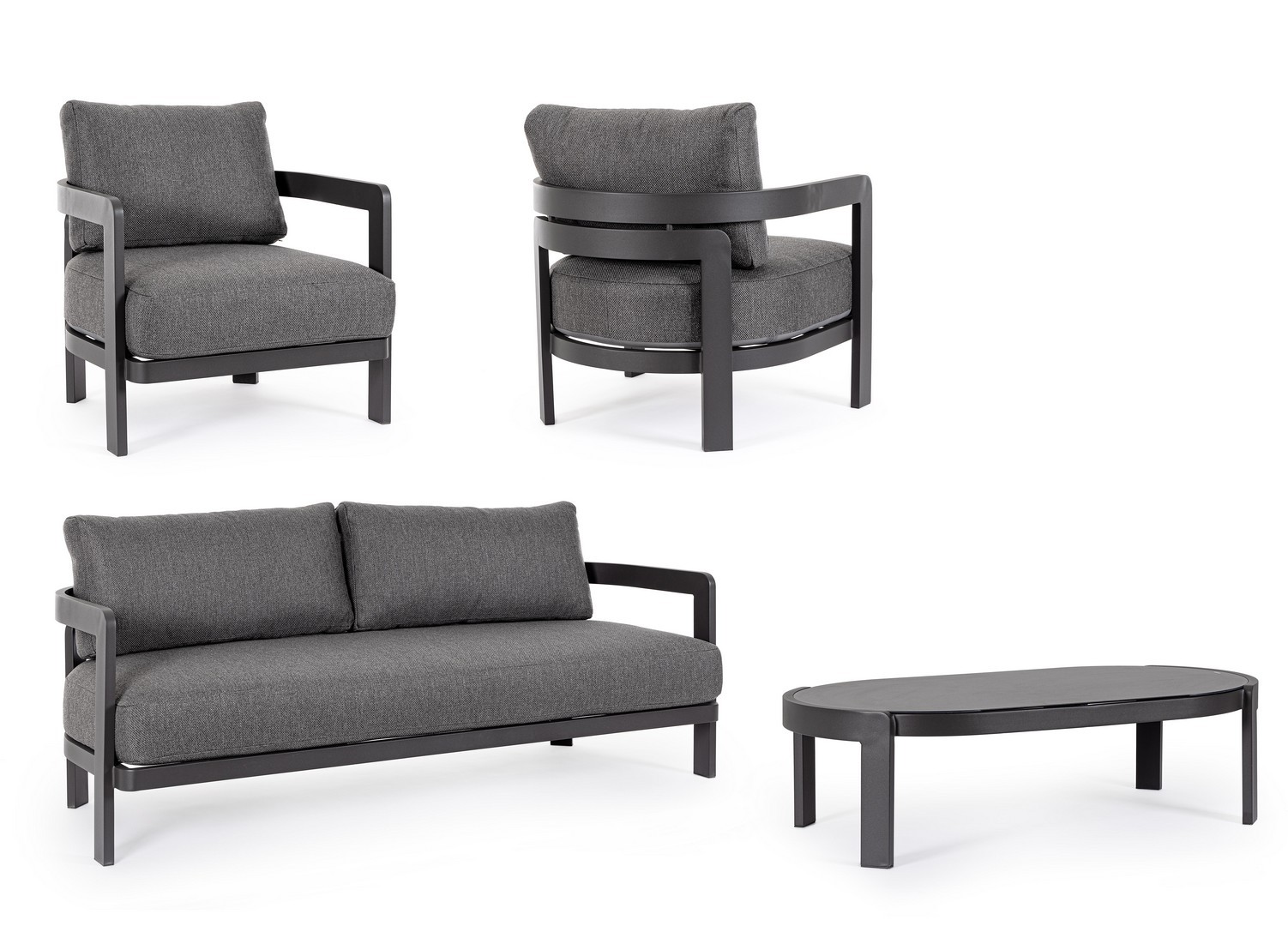 Struttura in alluminio verniciata a polvere (poliestere).  I cuscini della seduta e dello schienale sono sfoderabili con tessuto idrorepellente olefin (100% polipropilene). Il tavolino ha il piano in vetro temperato.