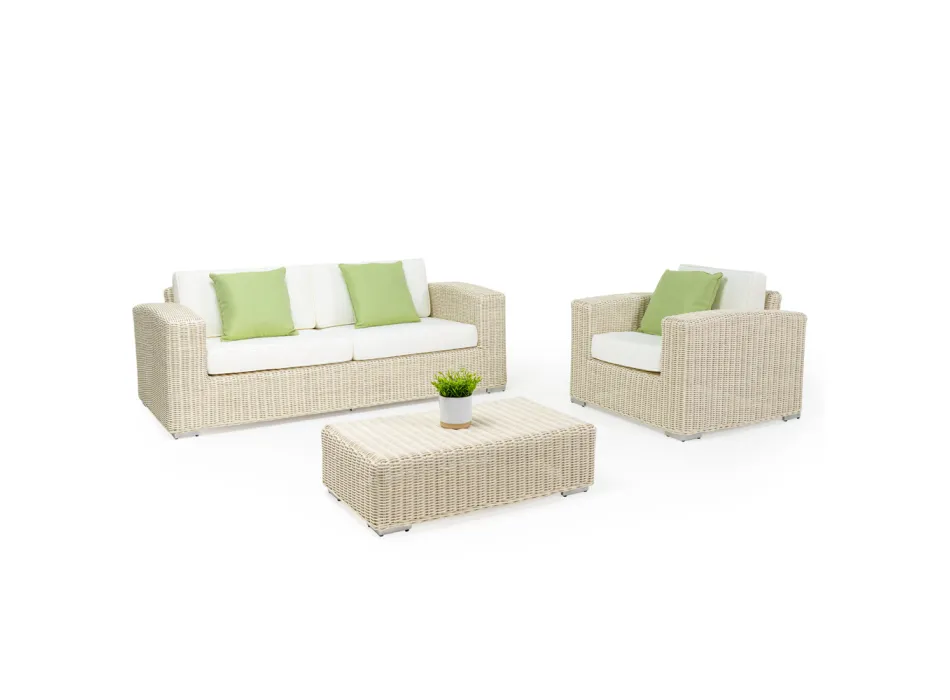Resistente ad agenti atmosferici e escursioni termiche. Il polietilene ad alta densità di marca Rehau, intrecciato a mano su telai di alluminio, rende questo set arredo da giardino un prodotto d’arredo di qualità .
